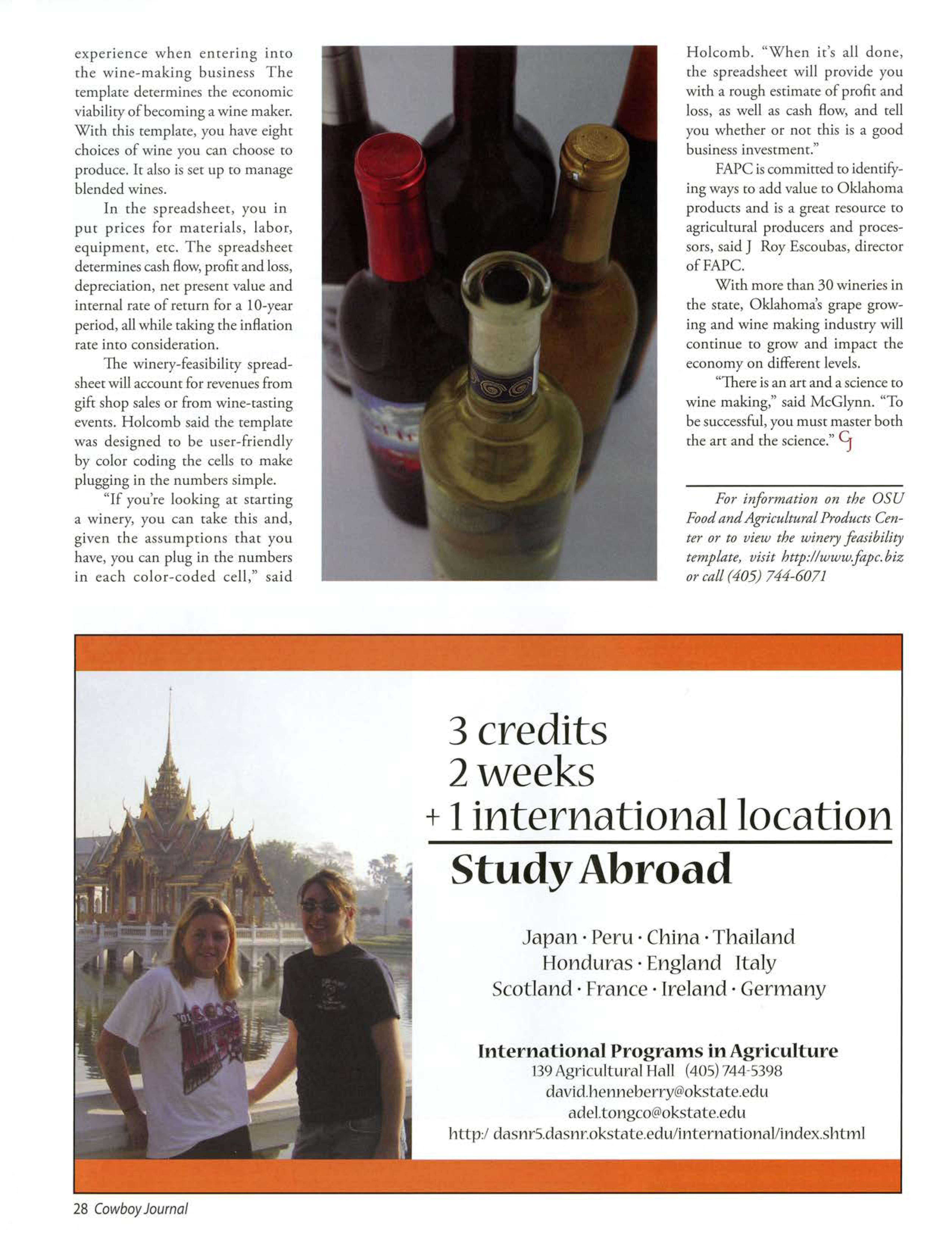 For more information about upcoming study abroad trips, call (405) 744-5398 or sendan e-mail to david.hennebeny@okstate. edu. To visit the InternationalAg;icuitural Programs Web site, click on international Travelat http://cmnr.okstate.edu,andfallow the internationalagriculturelink.