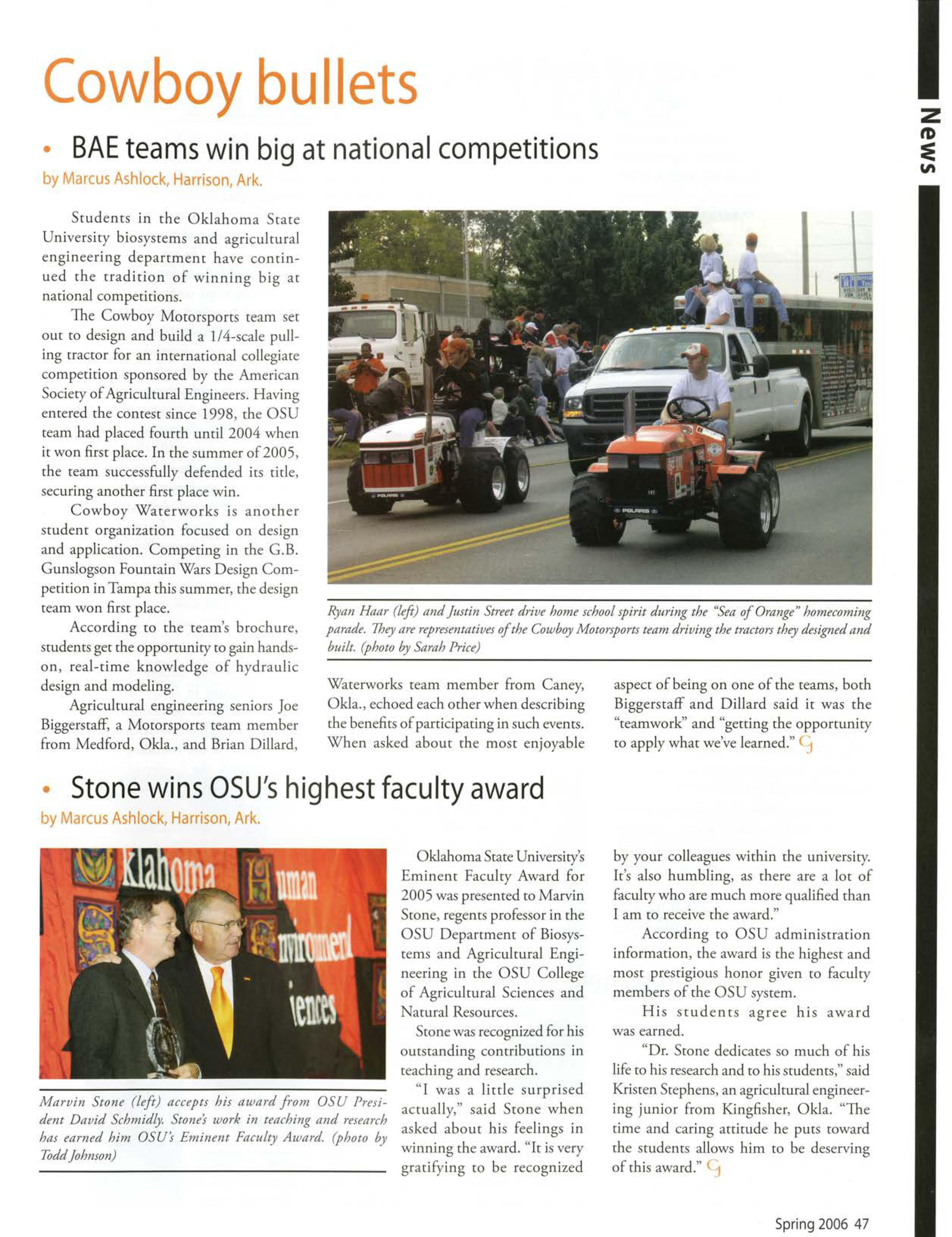 Students in the Oklahoma Seate University biosysrems and agricultural engineering departmem have continued the tradition of winning big ar national competitions.