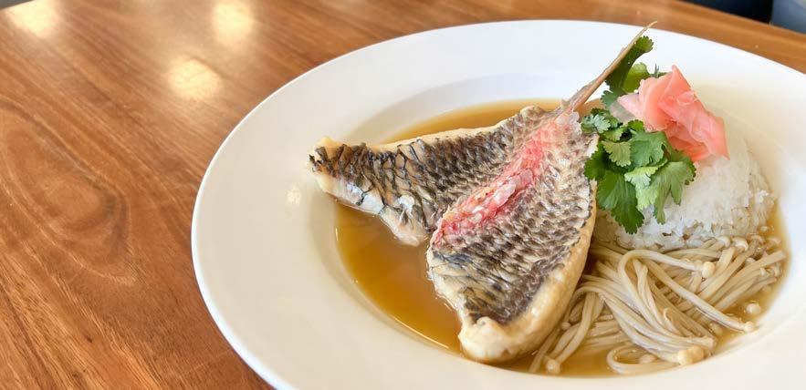 Parrot fish butterflied then poached in dashi soy and mirin. Served with steamed rice and enoki mushrooms.