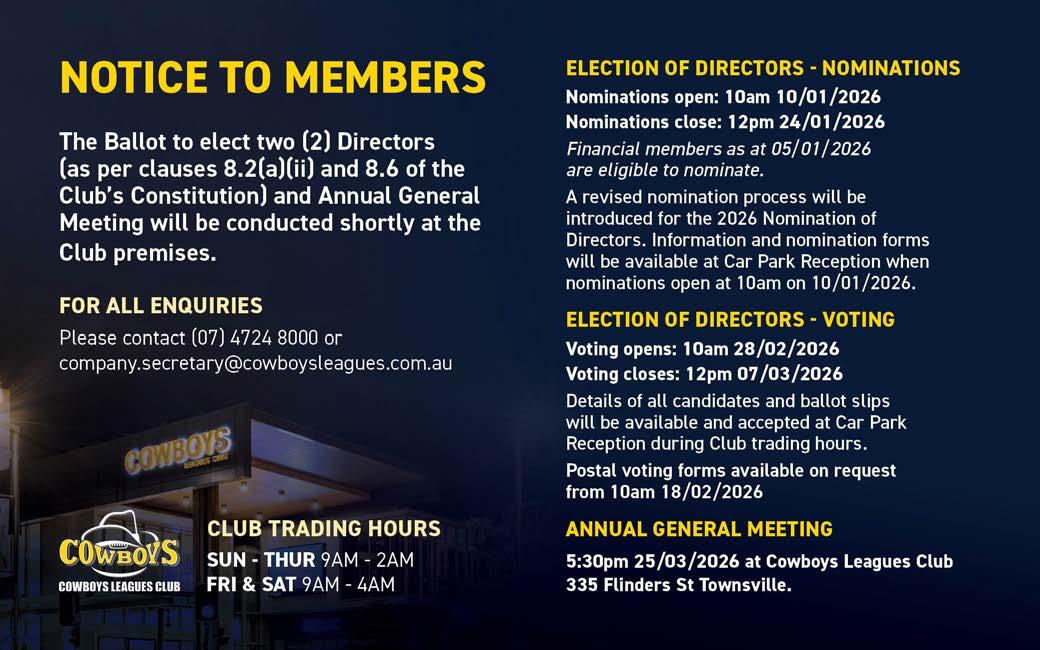 Finally, I would like to thank you for your ongoing support during 2025. On behalf of the Board of Directors, Management and all staff, we wish all members and their families a very Merry Christmas and a happy and prosperous new year, and we look forward to being Your Club in 2026.
