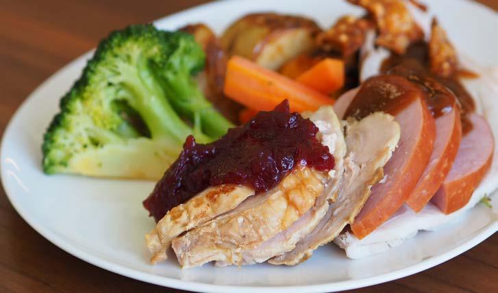 Roast medley with pork, turkey, and ham, served with roast vegetables, and a side of gravy and cranberry sauce.