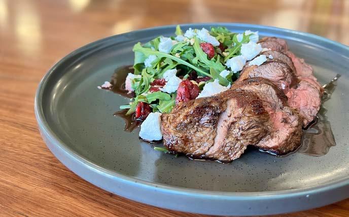 Tender lamb with pomegranate, creamy goat’s cheese, pine nuts and rocket, drizzled with balsamic reduction.