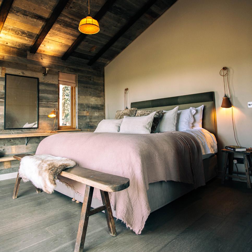 A lot of thought has gone into the interior design with Lou Davies of Box 9 Studios taking charge of the interiors. Vintage and antique furniture sits alongside locally sourced materials, all chosen with sustainability, provenance and durability in mind. The interior design celebrates natural beauty with vintage linens, sheepskins, woollen blankets and antique rugs in earthy forest tones.