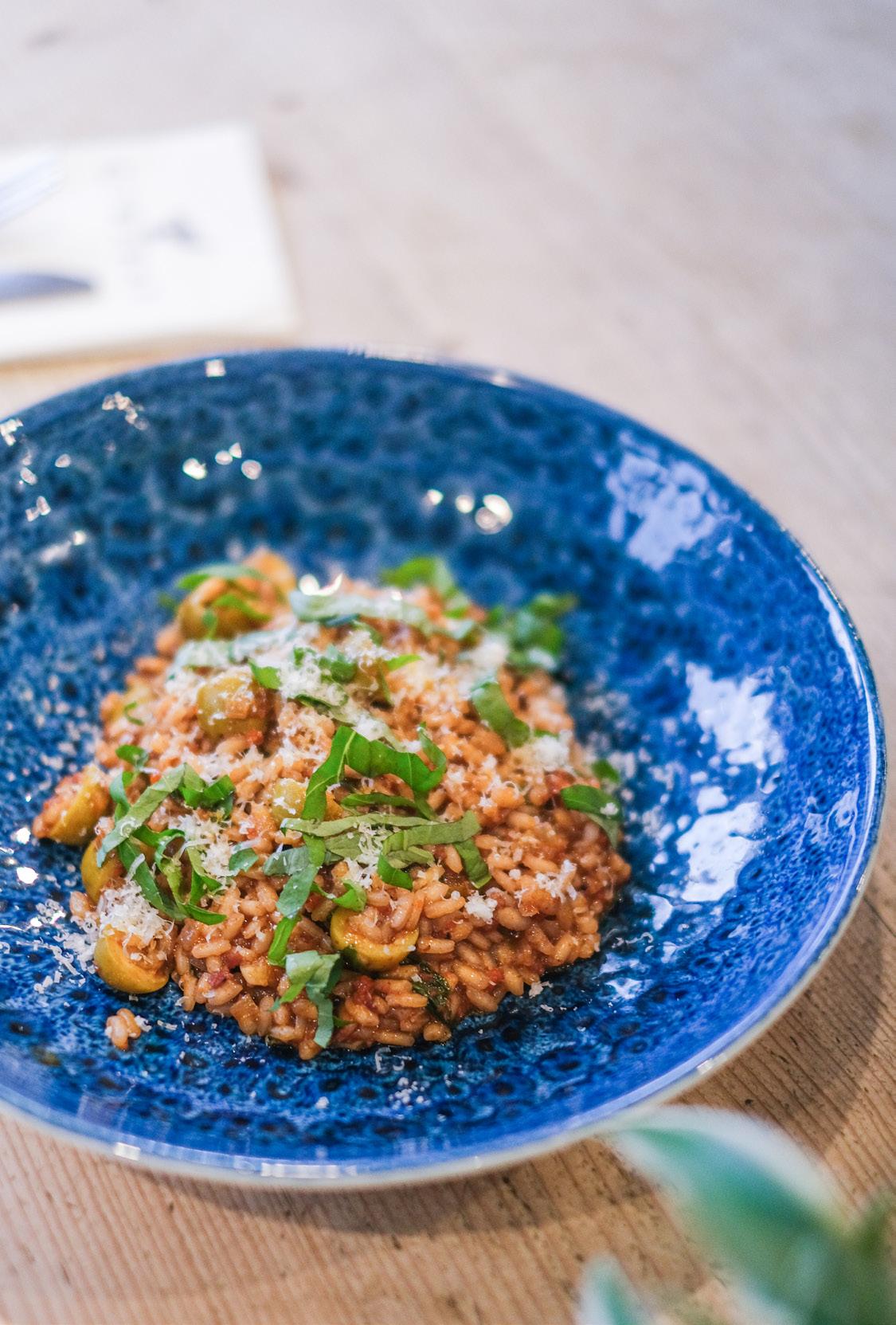 Skim half of the fat off the top of the risotto. Add two thirds of the parmesan, all the olives and half the basil and fold in gently.