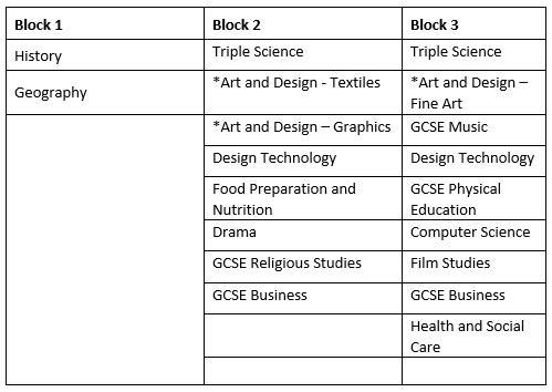 In addition to this they will choose Geography or History and two additional options. To make the timetable work, we have to put these subjects into blocks. You will be asked to pick one subject from each of the blocks below. Each subject must be different. Please note that on the options form you will be asked to give a back-up option from block 2 and 3. In the rare event that we cannot offer your first choice you will be given the back-up choice.