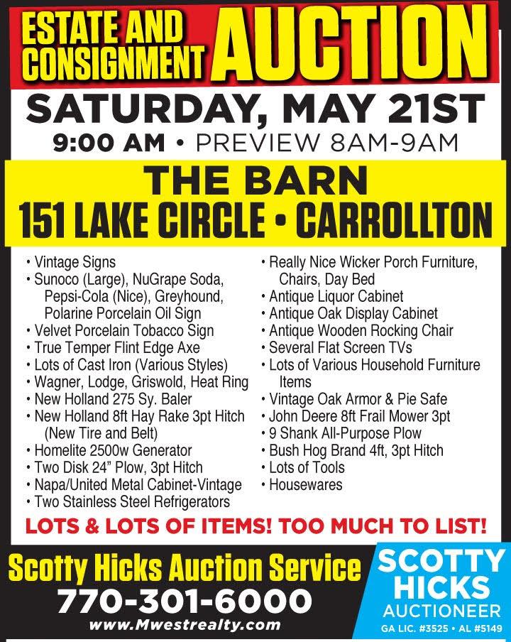 Set for Saturday, Sept. 7 at 9 am, Preview from 8-9 am. Trucks, Tractor, Farm Equipment, Golf Carts, Guns, Ammo, Hardware Store Cleanout. Auction at The Barn, 151 Lake Circle, Carrollton. Scotty Hicks Auction Service. Call 770-301-6000 or visit Facebook for more information.
