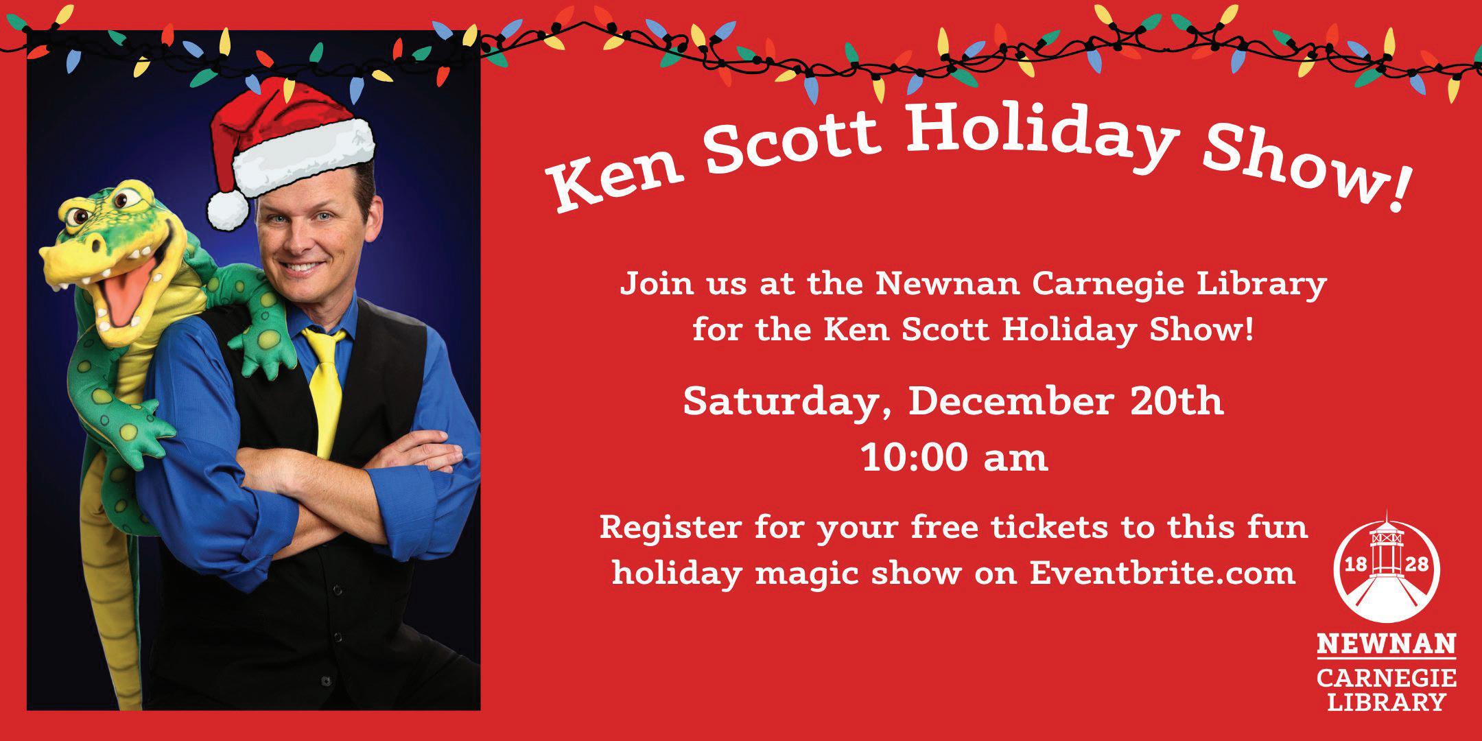 Join Newnan Carnegie for a special holiday show featuring magician, illusionist and humorist Ken Scott. Register at eventbrite.com for your free tickets. All ages welcome. Show starts at 10 a.m. 1 LaGrange St., Newnan