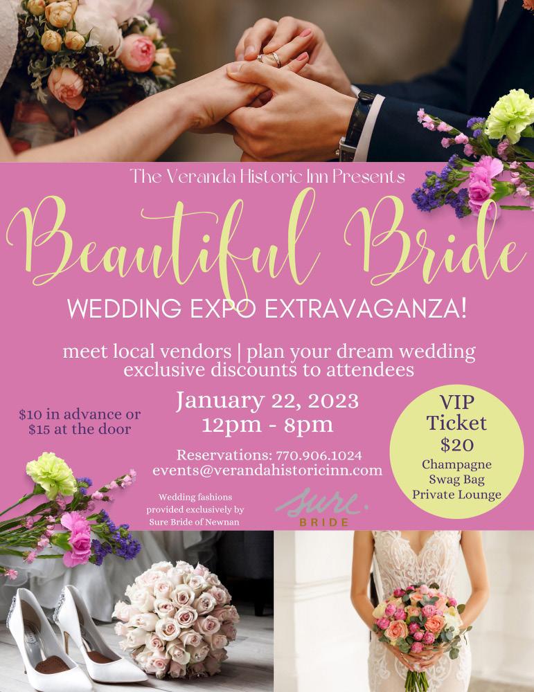 n “Beautiful Bride” a Wedding Expo Extravaganza at Senoia’s The Veranda Historic Inn, Noon to 8 p.m. Meet local vendors and plan your dream wedding. Tickets are $10 in advance, $15 at the door. Call for reservations at 770.906.1024.