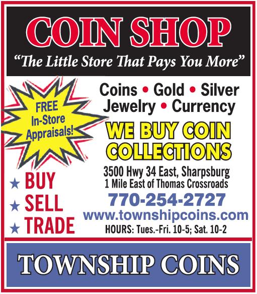 BUY-SELL-TRADE – We buy Coins, Gold, Silver, Jewelry, Currency and Coin Collections. Free In-Store Appraisals! Township Coins, 3500 Hwy. 34 East, Sharpsburg, 770-254-2727