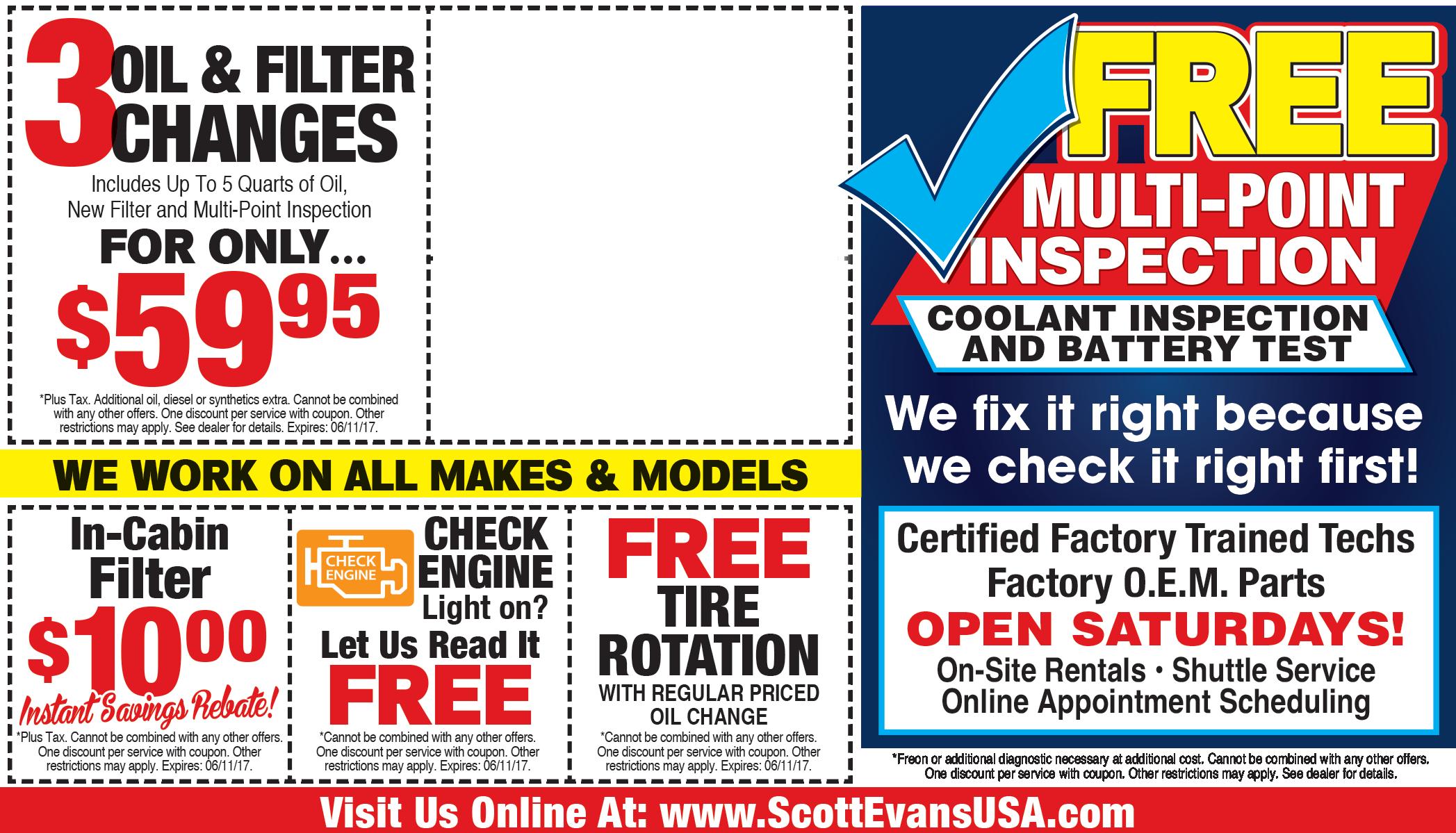 Page 15 We Make Sure You’re Ready For Your Next Road Trip! Plus tax. Additional oil, diesel or synthetics extra. Cannot be combined with any other offers. One discount per service with coupon. Other restrictions may apply. See dealer for details. Expires 9/30/23. Cannot be combined with any other offers. One discount per service with coupon. Other restrictions may apply. Expires 9/30/23. Plus tax. Additional oil, diesel or synthetics extra. Cannot be combined with any other offers. One discount per service with coupon. Other restrictions may apply. See dealer for details. Expires 9/30/23. $1995 1 OIL & FILTER CHANGE Includes up to 5 Quarts of Oil, New Filter and Multi-Point Inspection 4-Wheel Alignment $129.95 Reg. $9995 Cannot be combined with any other offers. One discount per service with coupon. Other restrictions may apply. Expires 9/30/23. BATTERY INSPECTION Cannot be combined with any other offers. One discount per service with coupon. Other restrictions may apply. Expires 9/30/23. $3995 $7995