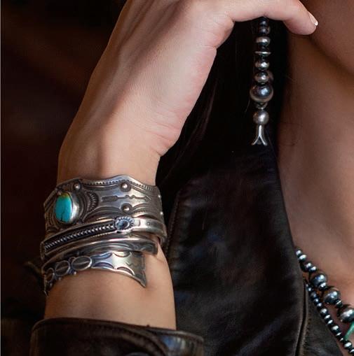 Vintage Zuni Squash Blossom, $4,950, Jessie Robbins Half Dollar Pendant Necklace, $450, Vintage Stamped Navajo Cuff, $1,700, Vintage Zuni Turquoise Row Cuff, $3,600, Vintage Zuni Needlepoint Ring, $625, Stamped Turquoise Ring, $425, Bead Ball Turquoise Accent Ring, $295, Linked Turquoise Cluster Earrings, $475 , Peyote Bird Designs, peyotebird.com; Ralph Lauren Silk Button Up, Editor’s Own; Sausalito Coat, $244.95, Ultra High Rise Jazmine Wide Leg Jeans, $84.95, Ariat, ariat.com; Spider Web Copper Boot, $620, Old Gringo Boots, oldgringoboots.com.