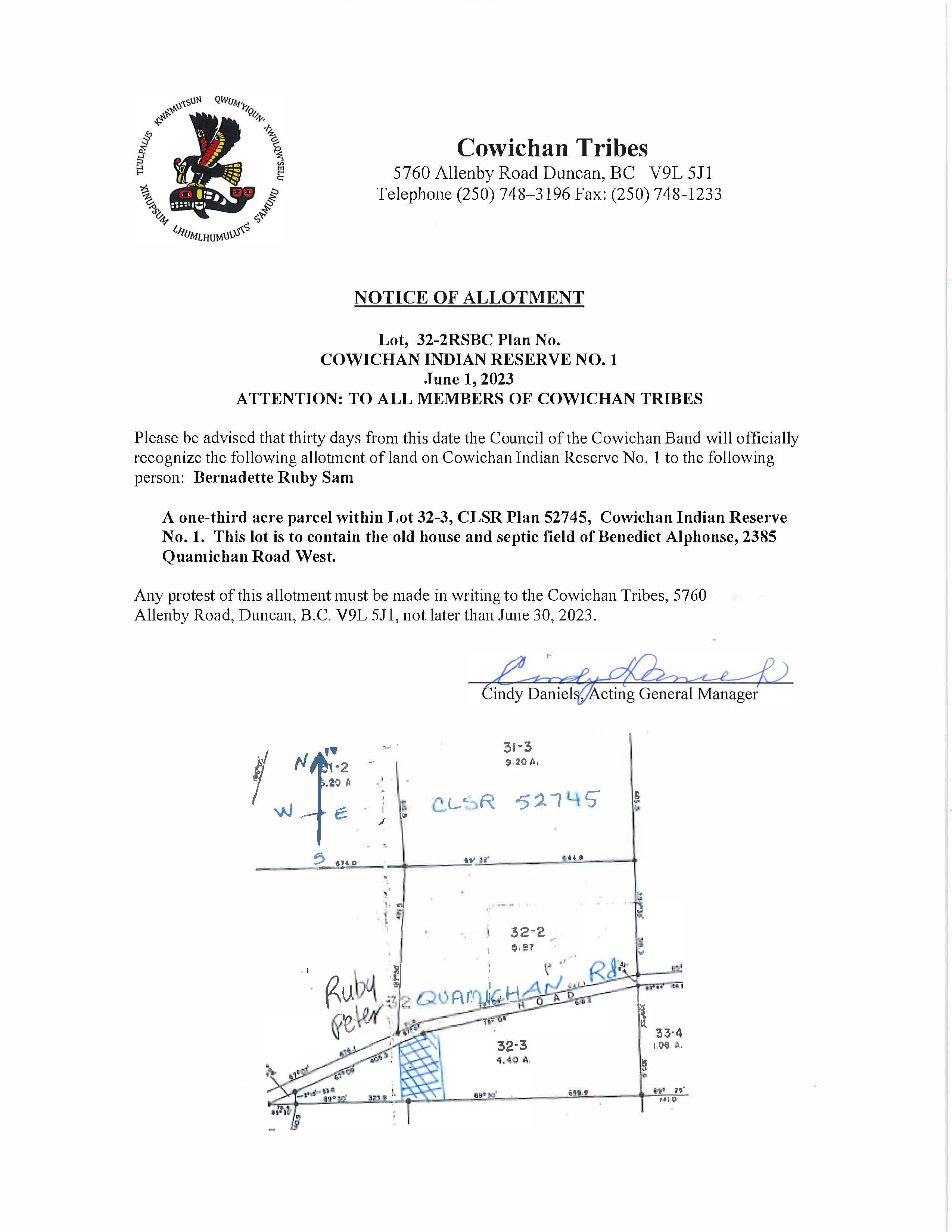 Lastly, for many years, Cowichan Tribes, along with other members of the Cowichan Nation, have been involved in litigation regarding the village and settlement near the mouth of the Fraser River at Tl'uqtinus. The court case is expected to be heard at the Duncan Court between July 4 and 7, 2023. Cowichan Citizens are invited to attend in person and there will be a virtual option made available. Closer to the date, we will share more details.