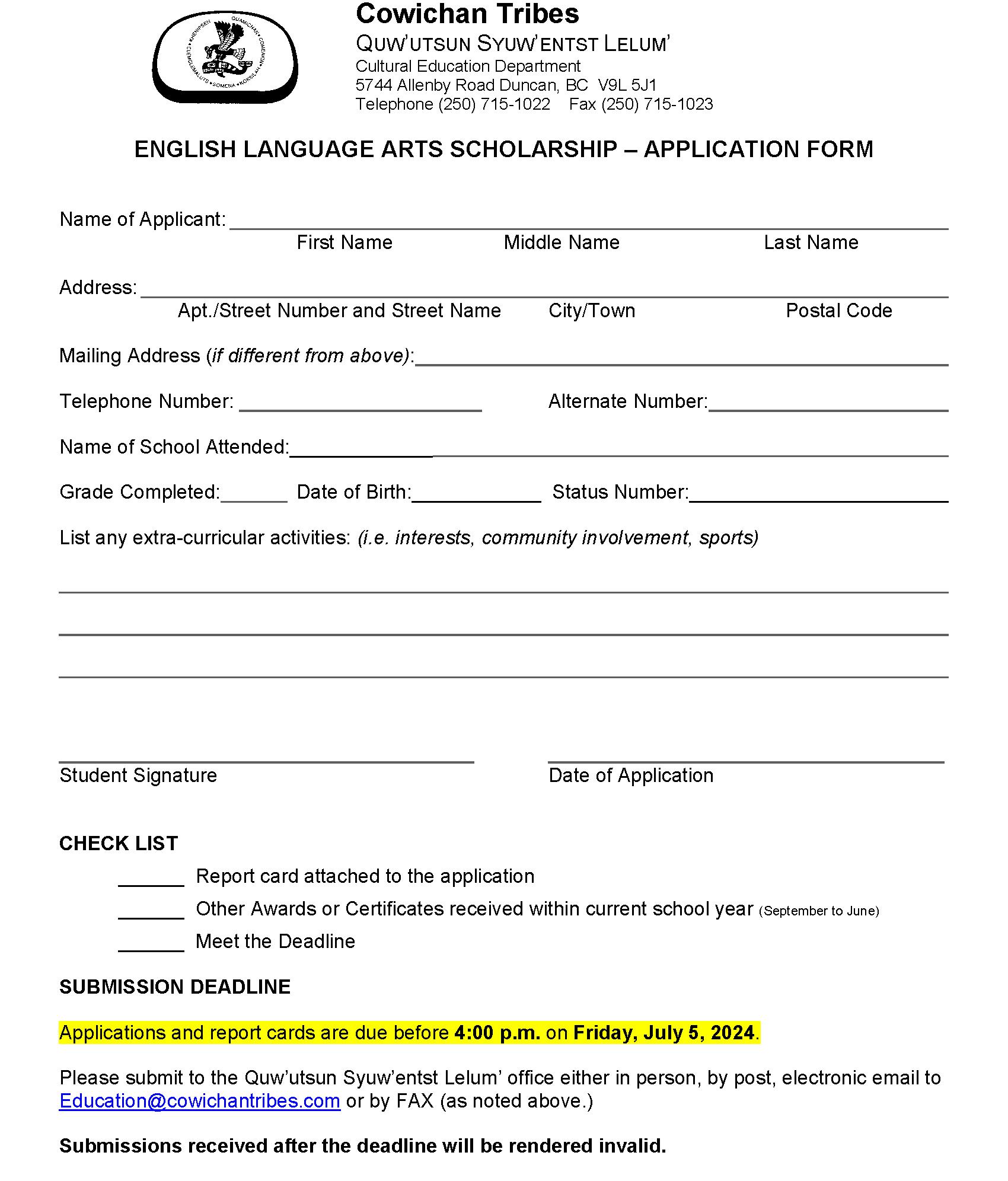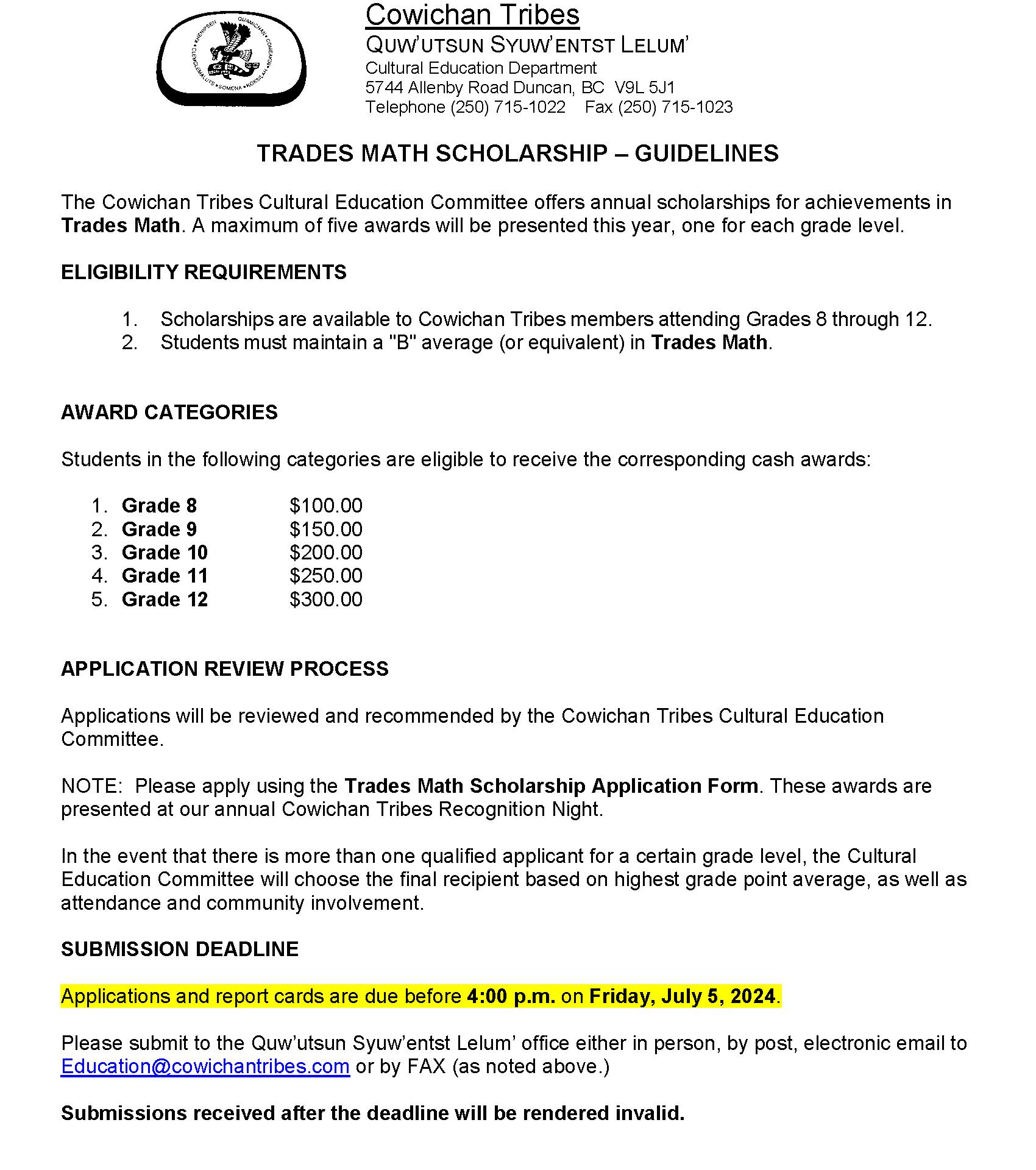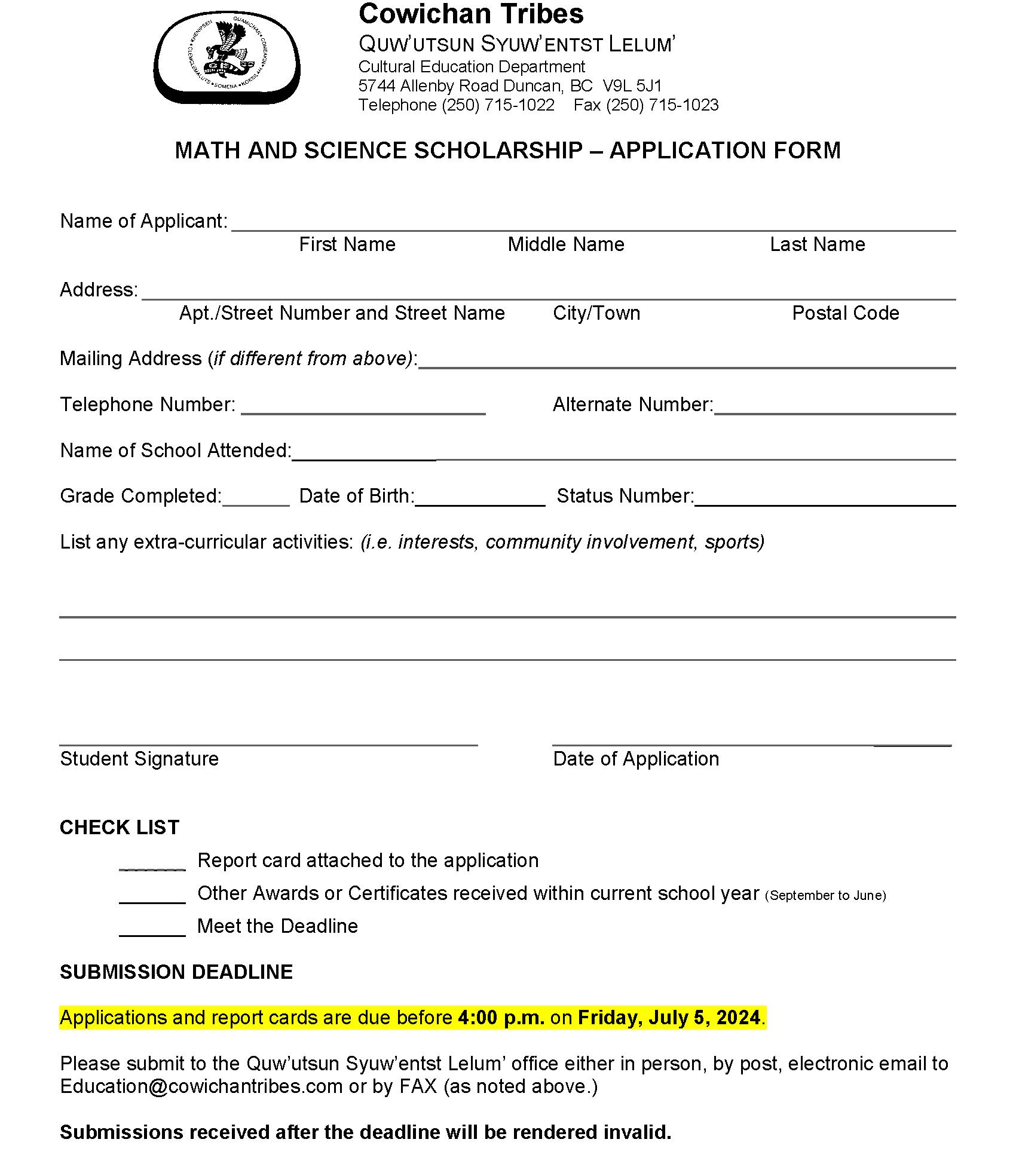 Applications are available at www.cowichantribes.com and the deadline is to submit your package is May 6, 2024 at 4:00 pm.