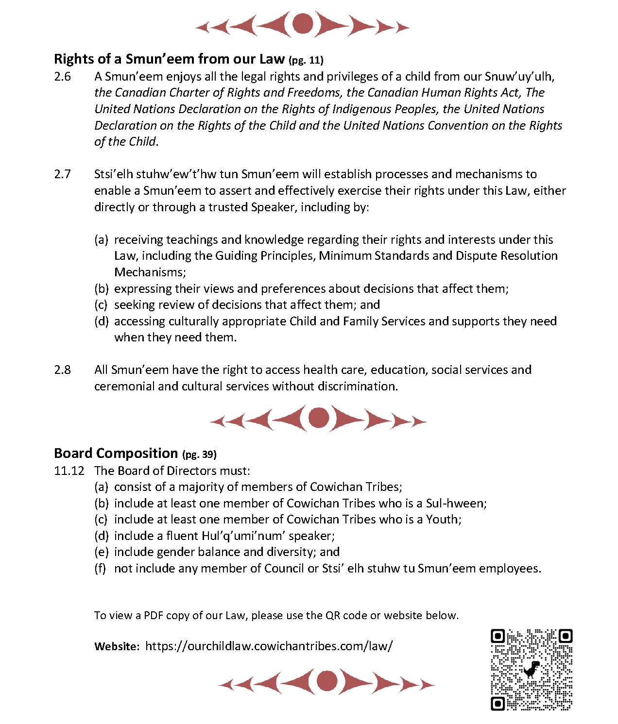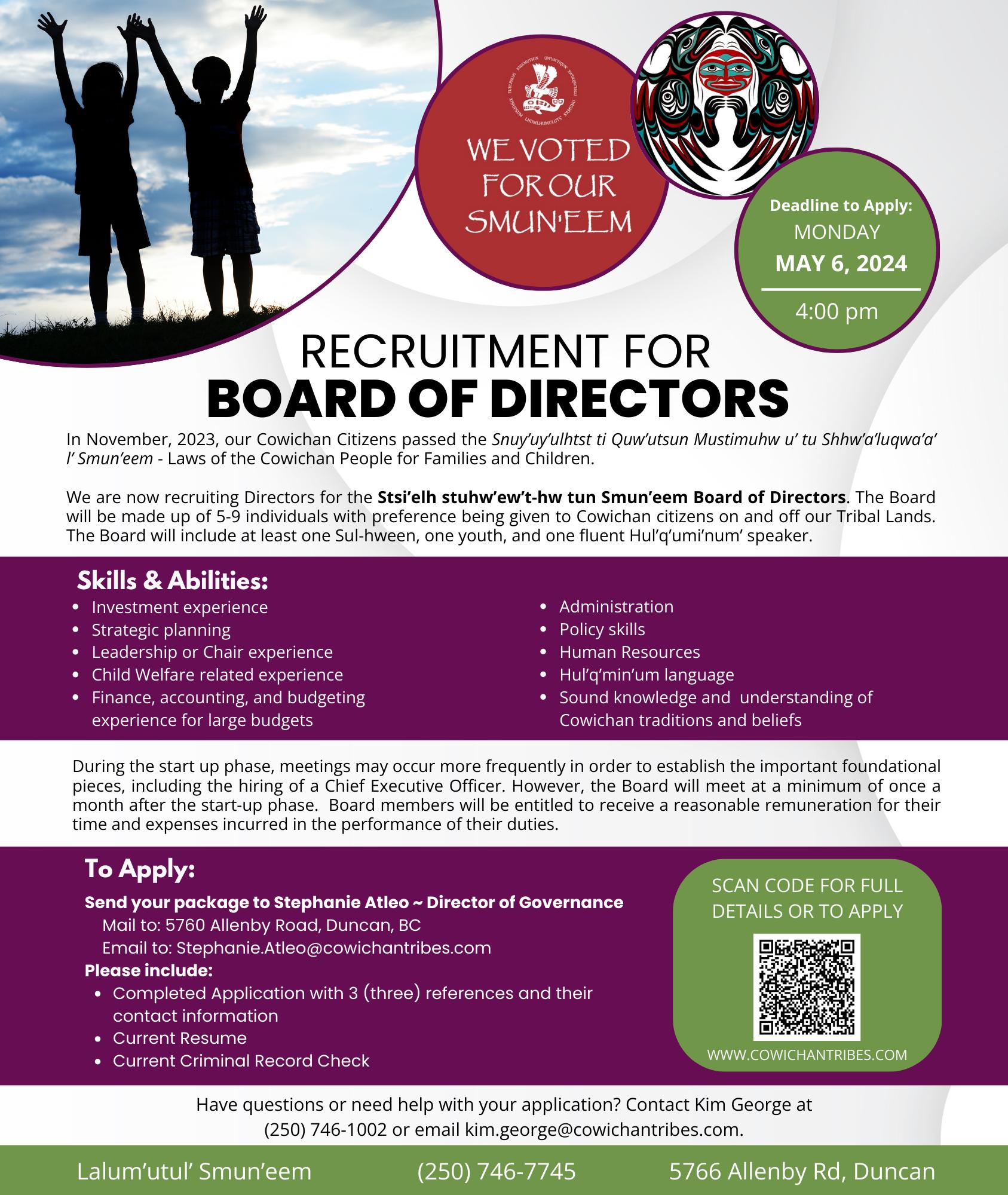 Following the successful passing of the Snuy’uy’ulhtst ti Quw’utsun Mustimuhw u’ tu Shhw’a’luqwa’a’ l’ Smun’eem - Laws of the Cowichan People for Families and Children, we are now preparing for full jurisdiction of Child and Family Services. This work includes recruiting 5-9 individuals to serve on the Stsi’elh stuhw’ew’t -hw tun Smun’eem Board of Directors. Preference will be given to Cowichan citizens on and off reserve and the Board will include at least one Sul-hween, one youth, and one fluent Hul’q’umi’num’ speaker.