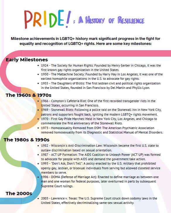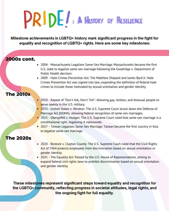TheInternalEducationCommitteeisexcitedtohonorthehistoryandongoingjourneyoftheLGBTQ+community We’retouchedonmilestonesoftheLGBTQ+movement,fromtheStonewallRiotstolandmarkSupremeCourtcases, eachplayingacrucialroleinthequestforequality.Thisjourneythroughhistoryisnotjustinformativebutalsoa reminderoftheresilienceandcourageofthecommunity.