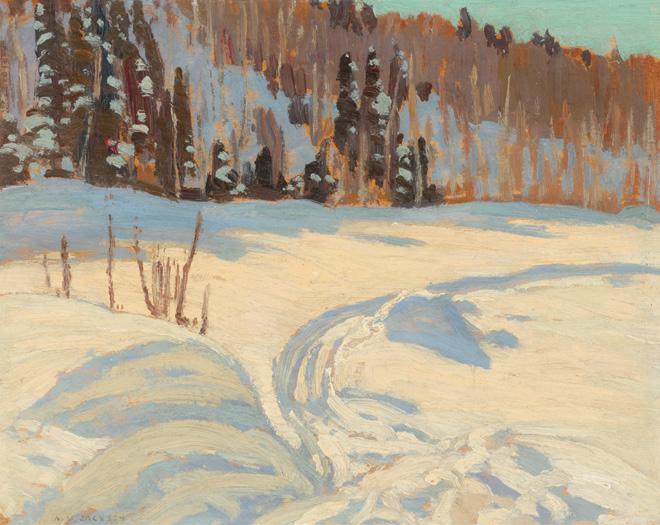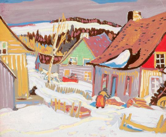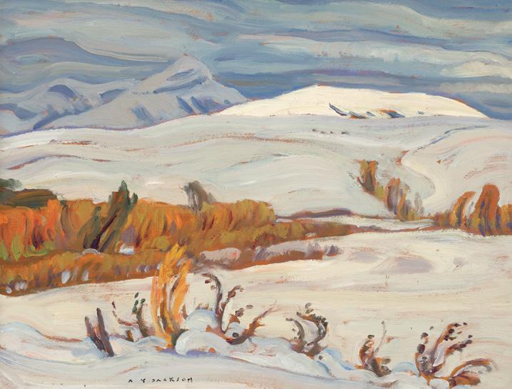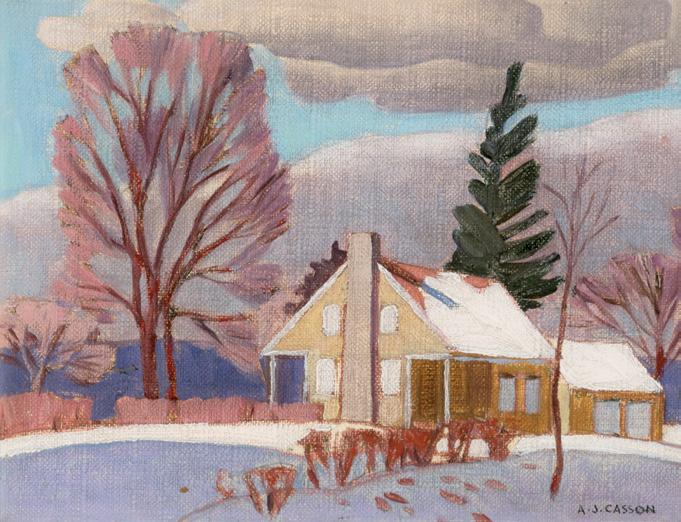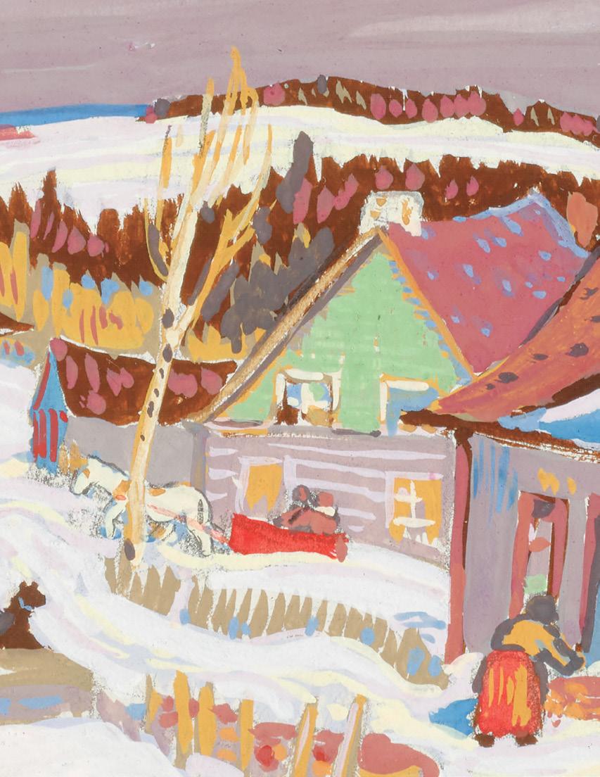 The red-painted house at the centre, its gabled roof covered with snow, anchors the scene against the undulating hills and animated sky beyond. Jackson’s distinctive, rhythmic brushstrokes animate the snow and clouds, lending the entire view a sense of movement and immediacy. Although no figures are present, the sleigh at the edge of the house quietly signals human activity. It hints at a recent arrival or perhaps impending departure, and invites the viewer to imagine the unseen inhabitants going about their day. This subtle narrative touch is typical of Jackson, who often suggested community without explicitly depicting it, allowing the viewer to sense rather than see the presence of people.