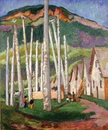 At the time when Carr visited, the Skeena valley was a site of tension and hostility between the Gitxsan and Wet’suwet’en people, to whom the government had allotted inadequate reserves that took no account of their traditional territories, and the flood of incoming settlers, who were pre-empting indigenous lands for agriculture and invading their traditional fishing and hunting grounds. Carr was eager to understand the function and meaning of the poles and to explain their significance to the settler community, whom she sought to educate about the Indigenous traditions and culture that she admired. Carr wrote and delivered a Lecture on Totems for a show of nearly two hundred paintings of First Nations villages and poles that she organized in Vancouver in 1913. There she related the story referred to on the Pole of Harhu , revealing that she had gained sufficient respect from the local Gitxsan people to be given an account: