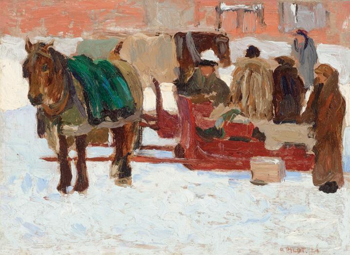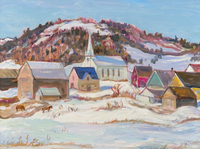 A.Y. Jackson devoted his long career to capturing the essence of rural and northern Canada. His small winter villages are among his most beloved subjects, offering glimpses of everyday life transformed by snow and light. This charming panel demonstrates Jackson’s signature brushwork and his ability to distill atmosphere and narrative from the simplest of settings.