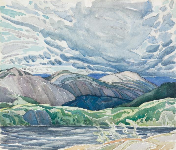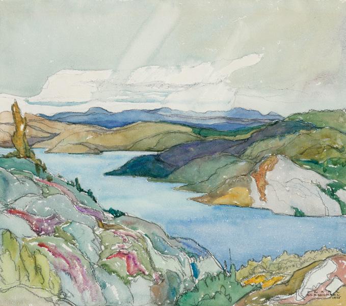 repeatedly to Cranberry Lake over two decades, producing an extensive body of sketches and paintings. From elevated vantage points, he captured sweeping views of the surrounding hills and lakes, exploring their shifting moods in every season. As the first member of the Group of Seven to immerse himself in this region, Carmichael inspired his peers, including A.Y. Jackson and Arthur Lismer, to visit during the 1930s.