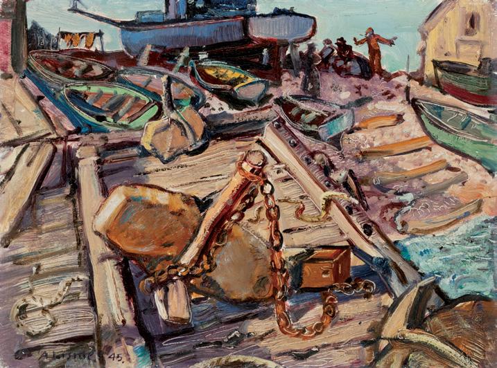 Arthur Lismer’s Launching the Blue Boat, Cape Breton, N.S., 1945 captures the dynamism and rugged vitality of maritime life on Canada’s East Coast. Painted in the mid-1940s, the work situates itself within Lismer’s broader exploration of Canadian identity through scenes of labour, industry, and the natural environment. The painting presents a lively coastal setting where labourers, boats, chains and anchors converge in a rhythmic composition that emphasizes the tactile world of the fishing community. Bold, expressive brushwork conveys both the weight of the equipment and the kinetic energy of human activity, reflecting Lismer’s commitment to portraying the Canadian landscape as a living, humanized environment—animated by the rhythms of work, weather, and community.