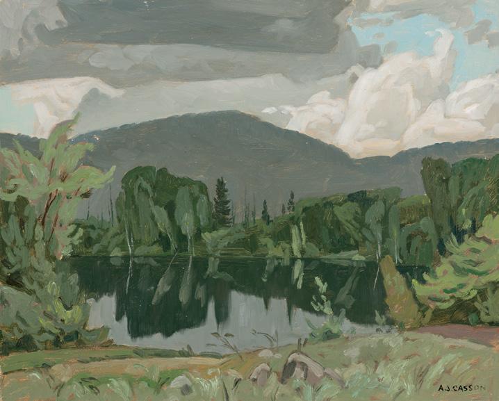 Madawaska River at Jewelville exemplifies the painter’s marked shift to a more abstract rendering of the Ontario landscape, which occurred in the mid-1940s. Paul Duval mentions that this change coincided with the end of the war, which may have subconsciously brought Casson an emotional release and a longing for simplicity. The artist began to portray nature in reductive, abstract designs, foregoing literal atmospheric portrayal. Duval writes of this shift: “Suddenly, all of the elements in his paintings become highly simplified into formal patterns. Shapes are condensed into knife-edged rectangles and triangles. Colours are plotted into very deliberate counterpointal arrangements, and natural texture is subdued almost to the point of elimination. Design has become paramount.” The author’s description of Casson’s new style is demonstrated in this painting, where the forest and its reflection in the Madawaska River appear flattened and angular. Above, heavy clouds gather in broad sweeps of grey and pale blue, their sculptural presence enhancing the painting’s compositional balance.
