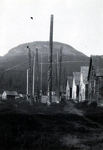 “One of these old mythological legends told me in Kispiox ran thus... This pole represents a woman's figure on the base, with a frog coming out of each eye and another out of the mouth. This is the story. A beautiful young woman went down to the water to clean her fish. She looked about her for a large flat stone to sit upon while she worked Now a monster in form of a frog had long loved her but she would have nothing to do with him, she used to climb out on a tree leaning over the water and taunt him when he would vainly try to clasp her reflection : so when he saw her come to clean her fish, he flattened himself out among the stones, and she taking him to be a large flat stone, sat upon his back & began to clean her fish; stealthily he slid into the water bearing her with him and down he dived to the bottom: where the fish were his slaves & the frogs his servants. The ducks and geese on the top of the water were the sentinels guarding his realm: For long she live(d) under there & wept & mourned to get back to her home & husband but in vain.– At last it was revealed to her by her guardian spirit, that there was a certain weed which all these people were very fond of & which if eaten by them would produce a sound sleep... She procured large quantities of this weed which they all devoured greedily & were soon fast asleep [so] she passed by the Monster & his people & rose to the top of the water... escaped & got back to her husband.”