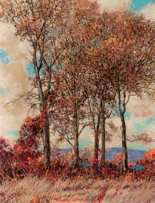 Silent Sentinels exemplifies Johnston’s mastery of light and pattern. Intermittent patches of teal-blue sky animate the background, contrasting with the muted, autumn tones of the trees and grass. The orange dabs of the shrubbery boldly draw the viewer’s gaze by standing forth from the cool tones of the distant hills and sky. The painting is expertly rendered with fine, precise brushstrokes, with delicate details adding vitality to every component of the picture. Over the course of his career, Johnston’s romantic style evolved and married with traditional realism.