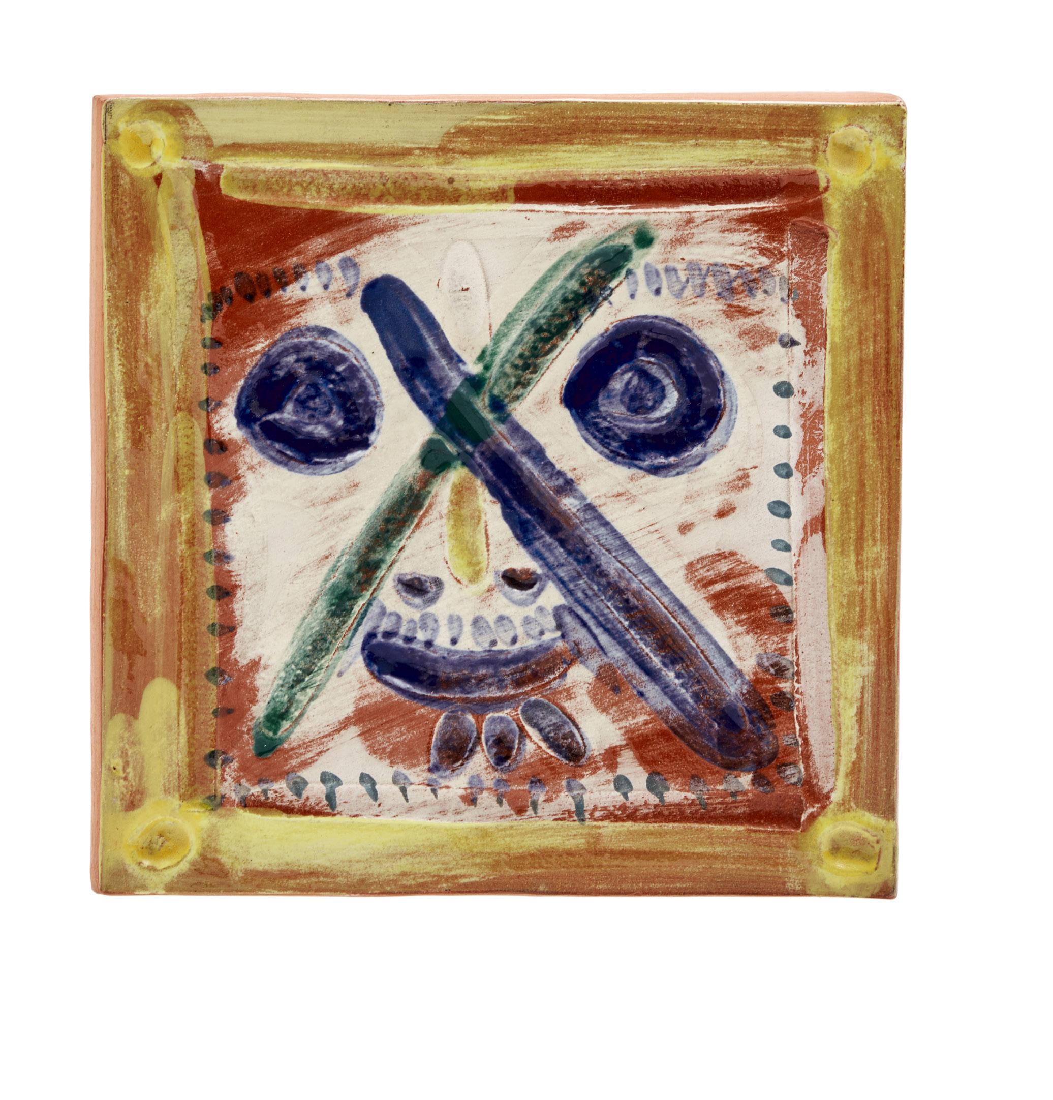 Visage aux traits en X (A.R. 556), 1968 partially glazed red earthenware clay plaque numbered 32/100 and inscribed “J. 136 B” and stamped “Madoura Plein Feu” and “Empreinte Originale de Picasso” on the reverse 6.75 x 6.75 x 0.75 ins (overall)