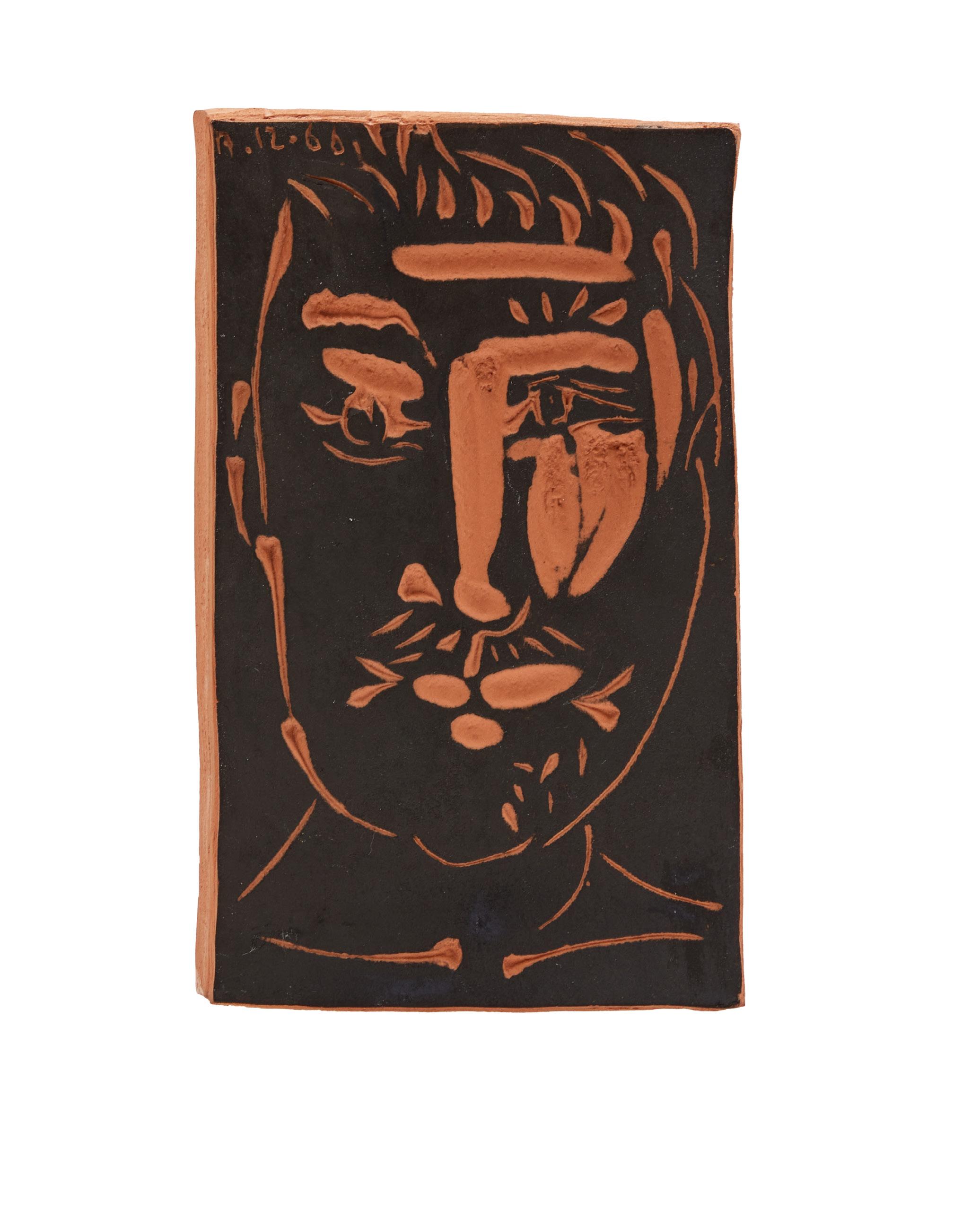 Little Bearded Face (A.R. 557), 1969 partially glazed red earthenware clay plaque numbered 29/100 and inscribed “J 139 A” and stamped “Madoura Plein Feu” and “Empreinte Originale de Picasso” on the reverse 6.5 x 6.5 x 0.75 ins (overall)