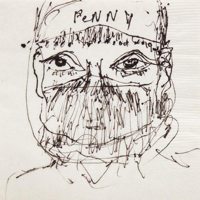 The legendary artist John Scott (1950-2022) was a regular at Lot 16, the tiny bar opened by Penny Rose on Queen Street West, in the early 2000s, which Poldaas, trained in architecture, designed. The Cameron House crew migrated first to The Gladstone, then to Lot 16. The sharpie napkin drawings series, of which half are available on auction, tells the story of a day Scott sat with Rose’s daughter and recast the characters sitting with them at the bar into his visual world: Penny Rose is drawn as a bunnie, serenaded in various ways, in black ink; and Poldaas is drawn by Scott as a levitating visionary, hovering over the bar and Queen Street West.