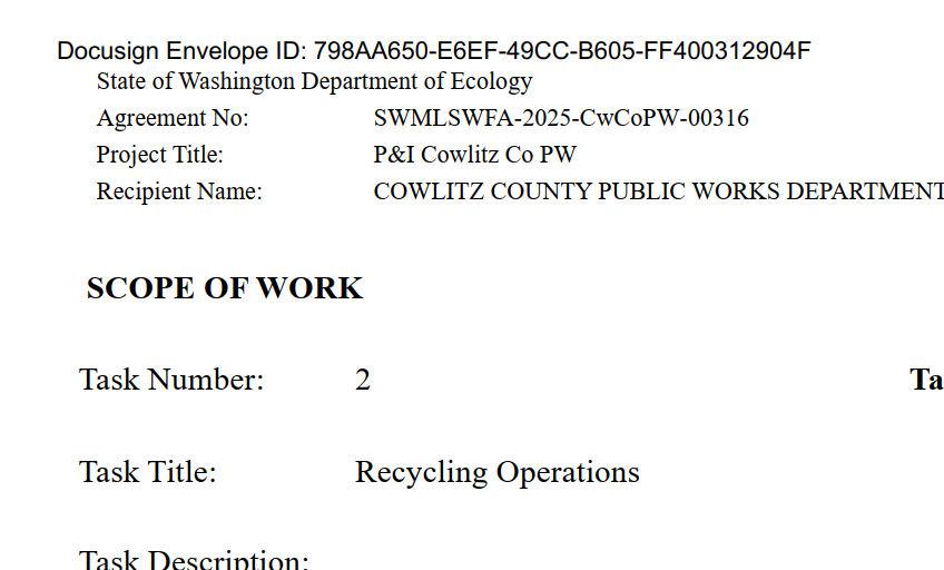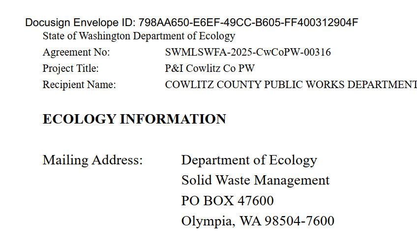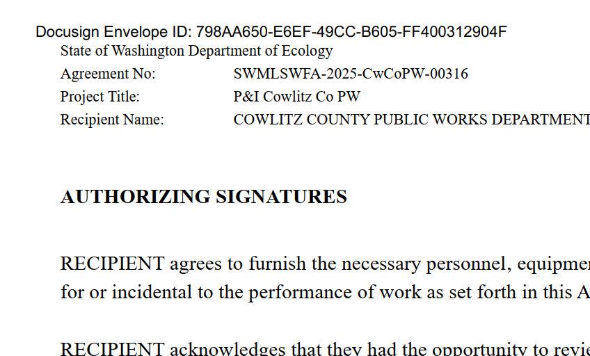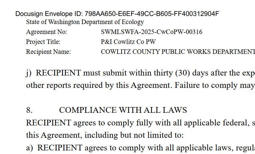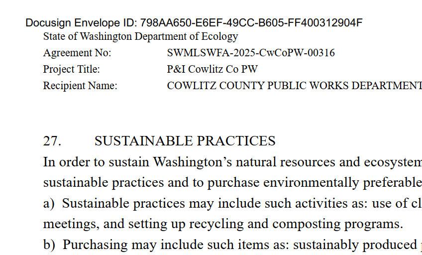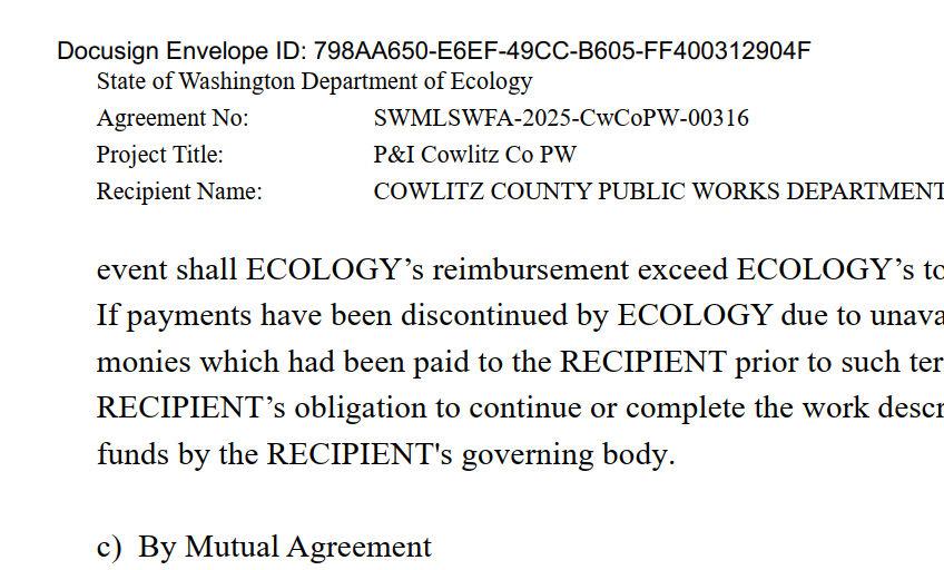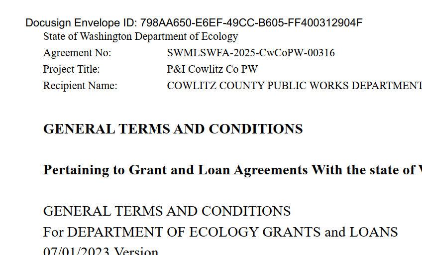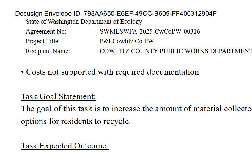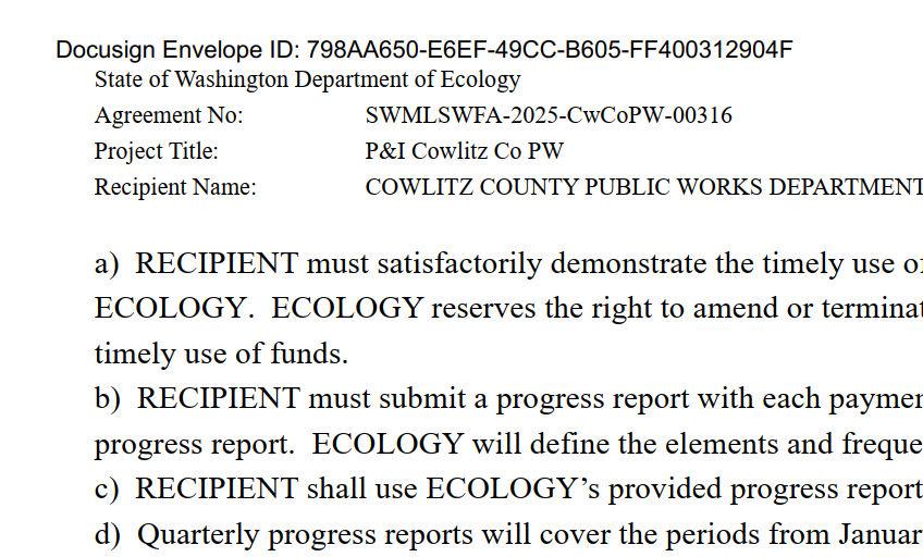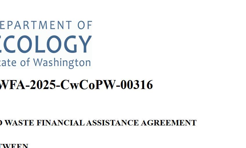 2. Solid Waste Management Local Solid Waste Financial Assistance Agreement with the Washington State Department of Ecology for operation and management of hazardous waste and recycling sites. The total grant amount is $482,626. (14263)