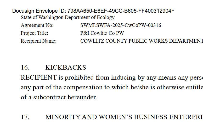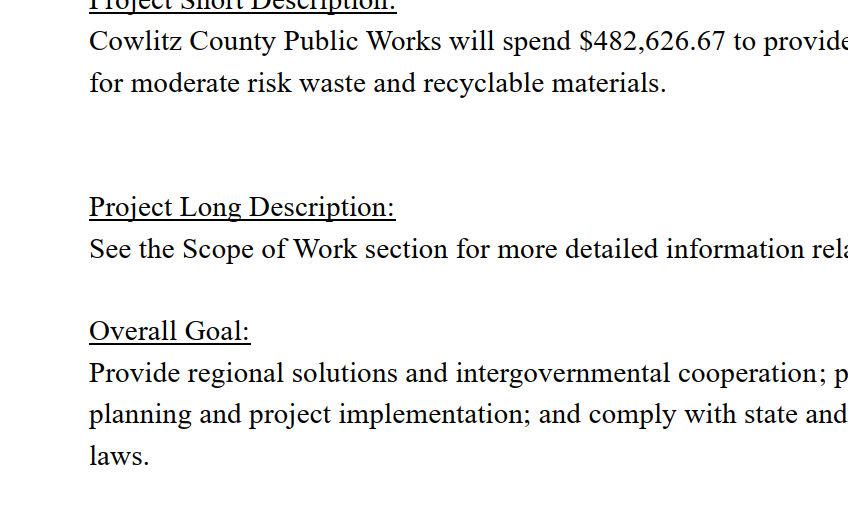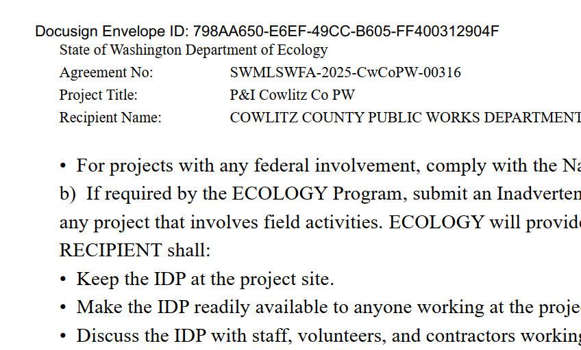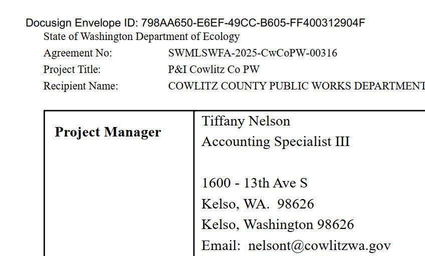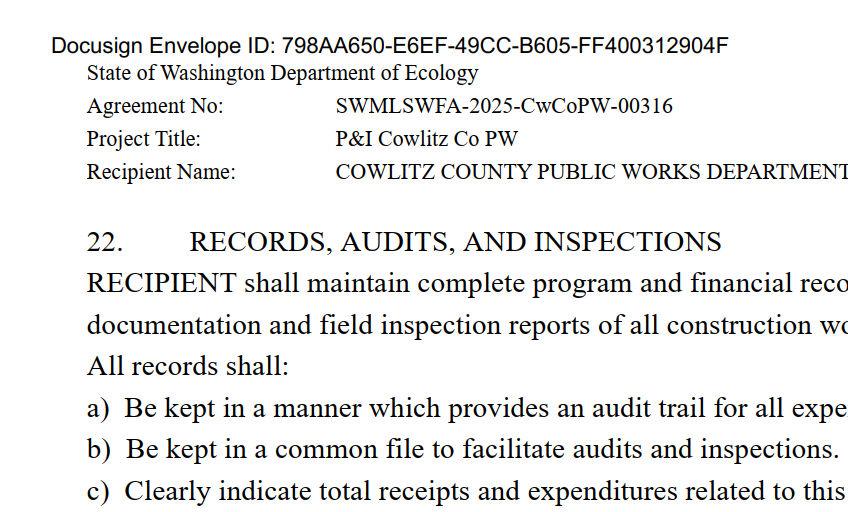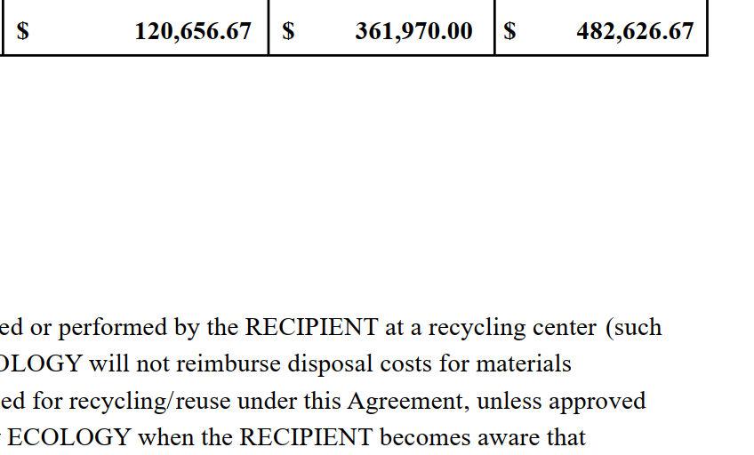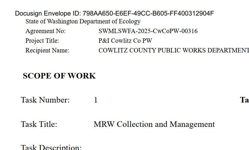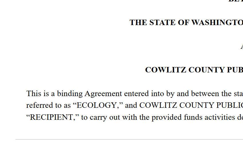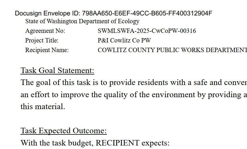 2. Solid Waste Management Local Solid Waste Financial Assistance Agreement with the Washington State Department of Ecology for operation and management of hazardous waste and recycling sites. The total grant amount is $482,626. (14263)