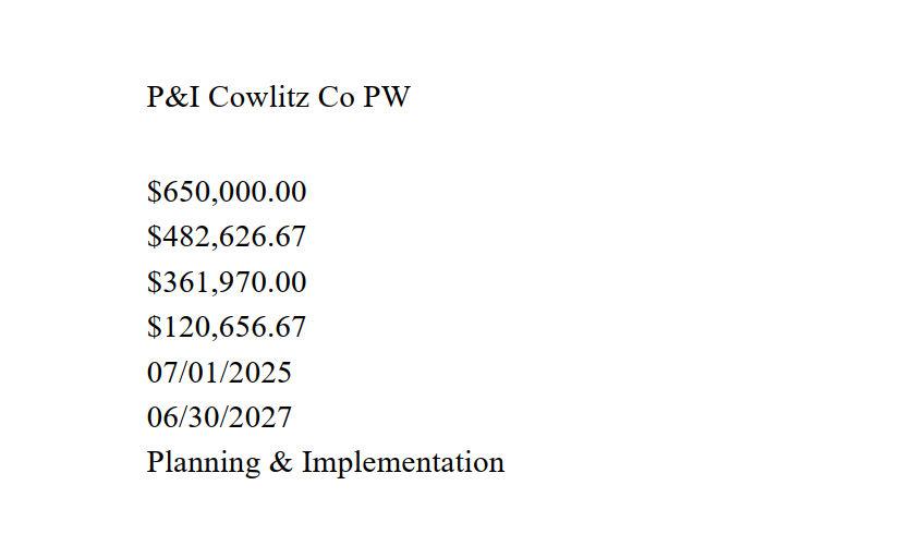 The Board of County Commissioners of Cowlitz County, Washington will receive sealed bids until June 9, 2025, prior to 1:30 p.m., for the following work: COUNTYWIDE DELINEATORS PROJECT.