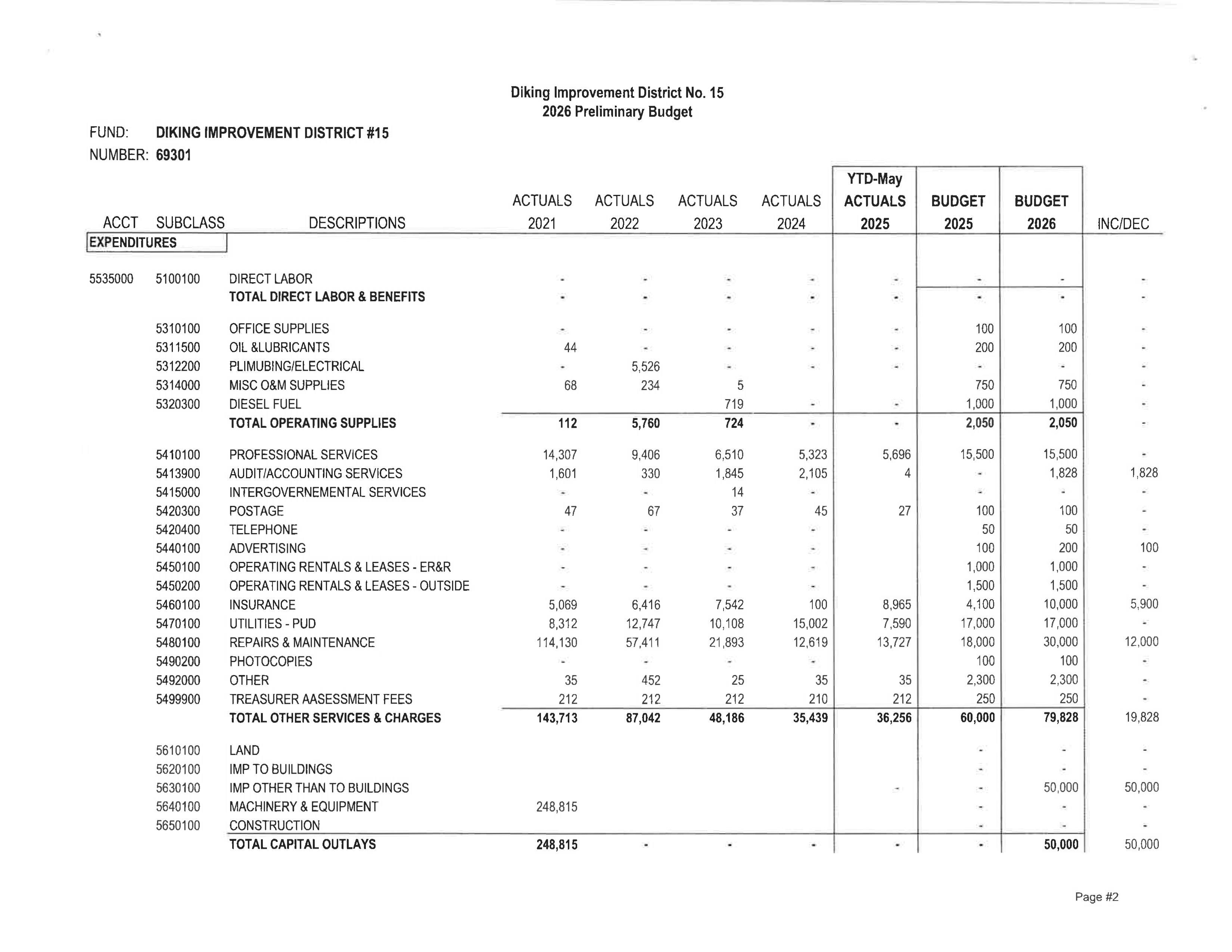 2026 Preliminary Budget Estimate for Diking Improvement District No. 15
