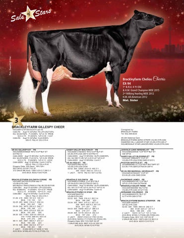 BRAEDALE GOLDWYN PB HOCANM10705608 *CVF*BYF*BLF GP-84-8YR-CAN EXTRA'05 GM'12 CAN-GEBV Aug*15 99%Rel GLPI+2596/99% KG M+115 F+40 %F+0.34 P+21 %P+0.16 CAN-GEBV Aug*15 99%Rel Conf+10 BRACKLEYFARM CO STAR PB HOCANF8640752 VG-88-5YR-CAN 02-02 305 7608 316 4.2 262 3.4 BCA 186 209 203 03-04 305 9901 415 4.2 347 3.5 309 9973 420 4.2 351 3.5 BCA 211 241 233 04-03 305 10955 402 3.7 388 3.5 BCA 218 217 246 05-05 305 10118 443 4.4 342 3.4 BCA 197 234 212 4 LACT: 49537 2102 4.2 1783 3.6 KG AVG BCA: M203(+17) F225(+34) P224(+35) Progeny Data: 0EX 1VG 0GP 0G 0F 1 DAUS ME AVG: 8907 410 4.6 320 3.6 AVG BCA: M168 F210 P193