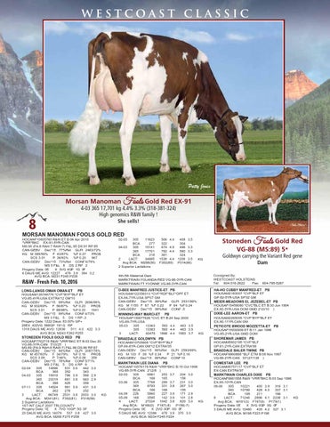 R&W · Fresh Feb. 10, 2016 ______ LONG-LANGS OMAN OMAN-ET __PB HOUSAM135746776 *CVF*BYF*BLF ET VG-85-4YR-USA EXTRA'12 GM'10 CAN-GEBV___ Dec*15 99%Rel__GLPI 2696/99% KG__M 932/69% __F 56/87% __%F 0.23 __PRO$ ____ SCS 3.01 ___ P 68/98% __%P 0.33 __1541 CAN-GEBV___ Dec*15 99%Rel__CONF 4/73% ___________ MS 3 F&L 5__DS 1 RP -3 Progeny Data: 1222 Daus: 83.00% GP+ 26EX 422VG 568GP 191 G 15F 1318 DAUS ME AVG: 12838 511 4.0 422 3.3 _ ________ AVG BCA: M243 F262 P255 STONEDEN FOOLS GOLD RED__PB HOCANF7702715 R&W *VRR*BKC ET B:03 Dec 20 VG-88-3YR-CAN 5*(0/25 ) MS:89 (FA:9 RAH:8 RAW:7) F&L:86 DS:89 RP:87 CAN-GEBV___ Dec*15 84%Rel__GLPI 2087/78% KG__M 457/63% __F 34/79% __%F 0.16 __PRO$ ____ SCS 3.09 ___ P 7/46% ___ %P-0.06 __359 CAN-GEBV___ Dec*15 78%Rel__CONF 5/71% ___________ MS 2 F&L 5__DS 4 RP 6 02-04 __305 ___ 14896 ___ 531 3.6 __442 3.0 _______ BCA_____ 366 ___ 352 ______ 343 04-03 __305 ___ 19918 ___ 786 3.9 __568 2.9 ______ _365 ___ 23019 ___ 881 3.8 __663 2.9 _______ BCA_____ 396 ___ 425 ______ 359 07-11 __305 ___ 14524 ___ 561 3.9 __431 3.0 _______ BCA_____ 262 ___ 278 ______ 252 3____ LACT: ___ 66749 __2531 3.8 _2003 3.0 __KG __Avg BCA: M341(81) F352(81) P318(59) 2 Superior Lactations 1ST INT.CALF 2007 TRI-COUNTY Progeny Data: 1E X 7VG 10GP 5G 0F 20 DAUS ME AVG: 14079 537 3.8 427 3.0 _______ AVG BCA: M266 F275 P258