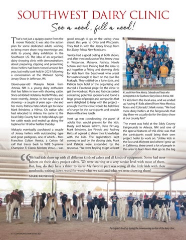 good enough to go on the spring show circuit this year to Ohio and Wisconsin. They tied in with the Jersey lineup from Bos Dairy, fellow New Mexicans. Venice had a good outing at both shows, and after the conclusion of the Jersey show in Wisconsin, Makayla, Patricia, Nicole Schirm and Kate Pirrung had the idea to put together a fitting and showing clinic for kids from the Southwest who aren’t fortunate enough to learn on the road like Makayla. They settled on a June date, and Patricia took hold of the organizing and started a Facebook page for the clinic to get the word out. Mark and Patricia started contacting potential sponsors and found a large group of people and companies that were delighted to help with the project – enough that the clinic would be held free of charge for the participants and provide them with a free lunch. Next up was coordinating the panel of adults that would present for the kids. Dusty and Nicole Schirm, Kate Pirrung, Mark Brindeiro, Joe Pinedo and Rodney Hetts all agreed to share their knowledge with the kids. The registrations kept coming in and by the closing date, Mark and Patricia were astounded by the response. “We were hoping to get at least