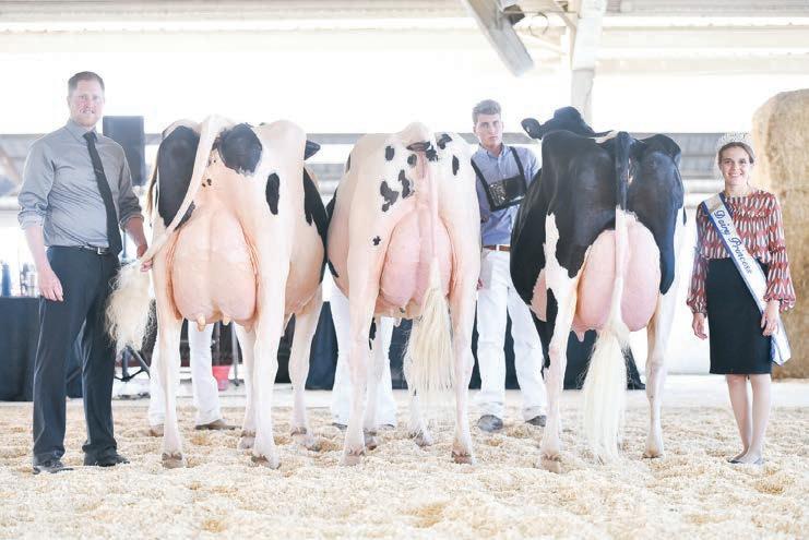 Lost Elm Tequila Baltimore (Tequila), 2nd 4-YearOld, Jason & Hazil Luttropp, WI Grand Champion RtoL: Grand Champion Woodmohr Forever Faithful, Milk Source LLC, WI; Reserve Grand Champion Pennwood Andreas Ilena, Budjon Farms & Peter Vail, WI; HM Grand Champion Kevetta Chrome Violin-ET, Declan Patten, Callum Moscript, and Frank & Diane Borba, WI.