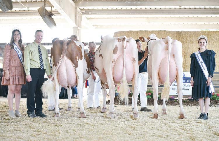 Exels Defiant Fanta 23435-Red (Defiant), 2nd Junior 3-Year-Old, Exels Holsteins, CA Grand Champion LtoR: Grand Champion Ruann Doorman Jean-55162-ET, Stephen & Patrick Maddox, CA; Reserve Grand Champion Den-K Monterey Delle 15, Exels Holsteins, CA; HM Grand Champion Agresti Absolute Pure-Red-ET, Gilbert Teixeira & Double D Dairy, CA.