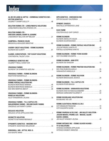 CRASDALE FARMS - FERME BLONDIN RIGHTSTAR SEAVER ELLA . . . . . . . . . . . . . . . . . . . . . . . . . . . . . . .25 CRASDALE FARMS - FERME BLONDIN FERME FORTALE HOLSTEIN INC BLONDIN MONTROSS MARINA . . . . . . . . . . . . . . . . . . . . . . . . .40 BLONDIN MONTROSS MARSALA . . . . . . . . . . . . . . . . . . . . . . . .41 EDG MIKI MARTHA 2020-ET . . . . . . . . . . . . . . . . . . . . . . . . . . . . .39 CRASDALE FARMS - FERME BLONDIN ROBELLA HOLSTEINS ALLEY WINDBROOK JALANA . . . . . . . . . . . . . . . . . . . . . . . . . . . .79 CRASDALE FARMS - T & L CATTLE LTD WALKERBRAE FARMS - WILSIM DAIRY FARMS CRASDALE LAUTHORITY SUNNY . . . . . . . . . . . . . . . . . . . . . . . . .80 DESLACS HOLSTEIN DESLACS LOTUS APPLEJUICE RED . . . . . . . . . . . . . . . . . . . . . . . .1 DESNETTE HOLSTEIN DESNETTE BETHANIE REGINALD . . . . . . . . . . . . . . . . . . . . . . . .77 DYNAMITE GENETICS - MAXIME ROY DYNAMITE ANASTASIA MILLENIUM . . . . . . . . . . . . . . . . . . . . .73 DINGWALL, IAN - KITTLE, NEIL G. SCO128 EPIC MIKKI . . . . . . . . . . . . . . . . . . . . . . . . . . . . . . . . . . . .50