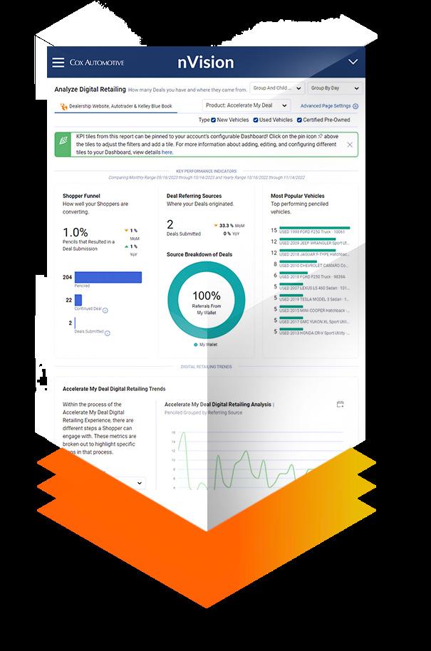 Powered by Cox Automotive proprietary data, nVision simplifies and boils down the complex story of the impact that Autotrader and Kelley Blue Book have had on a consumer’s online journey towards purchase. In nVision you can see a unified view of your digital marketing in one place, so you can quickly improve both your short- and long-term results, as well as get online marketing performance recommendations across all of your channels.