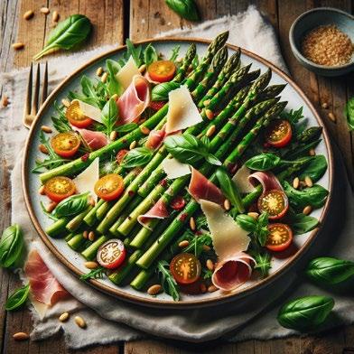 Skyll aspargesen i kaldt vann og stek den på middels varme i 5-10 minutter. Ha den i en bolle sammen med ruccula og basilikumbladene. Rør sammen ingrediensene til vinaigretten, og smak deg frem til en fin balanse mellom det syrlige og søte. Hell omtrent halvparten av vinaigretten over salaten og vend forsiktig sammen.