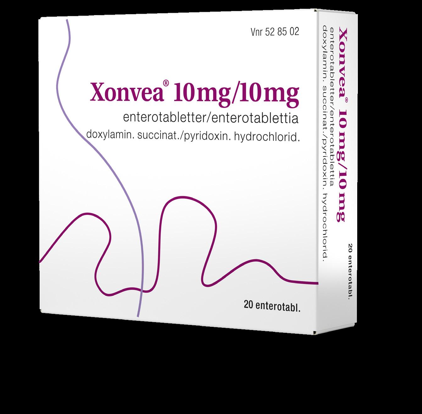 Xonvea (doksylamin og pyridoksin), enterotablett 10 mg/10 mg. Indikasjoner: For behandling av svangerskapskvalme og -oppkast (NVP) hos gravide kvinner ≥18 år som ikke responderer på konservativ behandling (dvs. livsstil- og kostholdsendringer). Dosering: Den anbefalte startdosen er to tabletter ved leggetid (dag 1). Hvis symptomene vedvarer til ettermiddagen på dag 2, bør pasienten fortsette med den vanlige dosen på to tabletter ved leggetid (dag 2), og på dag 3 ta tre tabletter (en tablett om morgenen og to tabletter ved leggetid). Hvis disse tre tablettene ikke gir tilstrekkelig symptomkontroll på dag 3, kan pasienten ta fire tabletter fra dag 4 (en tablett om morgenen, en tablett midt på dagen og to tabletter ved leggetid). Den maksimale anbefalte daglige dosen er fire tabletter (en om morgenen, en midt på dagen og to ved leggetid). Skal tas som en daglig forskrivning, og ikke etter behov. For å forebygge at svangerskapskvalme og -oppkast plutselig kommer tilbake, anbefales en gradvis nedtrappingsdose ved seponeringstidspunktet. Administrasjonsmåte: Administreres på tom mage med et glass vann. Svelges hele og skal ikke knuses, deles eller tygges. Pakninger og priser: 10 mg/10 mg: 20 st Maksimal AUP 299,50 kr, 40 st Maksimal AUP 485,00 kr. Reseptgruppe C. Viktig sikkerhetsinformasjon: Kontraindikasjoner: Overfølsomhet overfor doksylaminsuksinat, andre etanolaminderivative antihistaminer, pyridoksinhydroklorid. Samtidig bruk med monoaminoksidasehemmere (MAO-hemmere). Advarsler og forsiktighetsregler: Kan forårsake somnolens. Anbefales ikke ved samtidig bruk av legemidler som hemmer sentralnervesystemet, inkludert alkohol, hypnotiske sedativer og beroligende midler. Brukes med forsiktighet hos pasienter med astma, økt intraokulært trykk, trangvinkelglaukom, magesår med stenose, pyloroduodenal obstruksjon og blærehalsobstruksjon. Inneholder pyridoksinhydroklorid og derfor skal ytterligere nivåer fra kosten og vitamin B6-tilskudd vurderes. Inneholder azo-fargestoffet allurarød AC aluminiumslakk (E129) som kan gi allergiske reaksjoner. Inneholder benzosyre (E 210). Pasienter med hyperemesis gravidarum skal behandles av spesialist. Det har vært rapportert falske positive urinscreeingstester for metadon, opiater og fensyklidinfosfat ved bruk av doksylaminsuksinat/pyridoksinhydroklorid. Graviditet og amming: Brukes av gravide kvinner. Amming: Anbefales ikke under amming. Påvirkning av evnen til å kjøre bil og bruke maskiner: Xonvea har moderat til stor påvirkning på evnen til å kjøre bil og bruke maskiner. Aktiviteter som krever fullstendig mental oppvakthet, som å kjøre eller bruke maskiner, bør unngås til helsepersonell sier at de kan gjøre det. Bivirkninger: Hyppigst rapporterte var somnolens. Alvorlig døsighet kan oppstå ved samtidig bruk av CNS-hemmende midler, inkludert alkohol. Antikolinerge effekter av Xonvea kan forlenges og forsterkes av monoaminoksidasehemmere. Mulige klasserelaterte bivirkninger av antihistaminer, inkluderer: tørr munn, nese og hals, dysuri, urinretensjon, vertigo, synsforstyrrelser, uklart syn, diplopi, tinnitus, akutt labyrintitt, insomni, tremor, nervøsitet, irritabilitet og facial dyskinesi. Tetthet i brystet, fortykkede bronkiesekresjoner, hvesing, tett nese, svette, frysninger, tidlig menstruasjon, toksisk psykose, hodepine, svakhet og parestesi har forekommet. I sjeldne tilfeller er agranulocytose, hemolytisk anemi, leukopeni, trombocytopeni og pancytopeni, økt appetitt og/eller vektøkning rapportert.