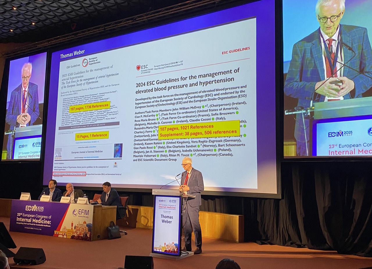 The European Society of Hypertension (ESH) hadde en oppdatering om de nåværende europeiske retningslinjene for behandling av hypertensjon ved Thomas Weber fra Østerrike, jf. bilde 9. Han pekte på at ved blodtrykk målt 120-139/7089 med samtidig kardiovaskulær risiko eller blodtrykk 140-159/90-99 mmHg på kontoret, anbefalte man ambulatorisk måling eller blodtrykksmåling hjemme. Det ble anbefalt måling av blodtrykk to ganger for å bekrefte diagnosen. Hvis blodtrykket er over eller lik 140/90 mmHg, bør antihypertensiv behandling startes. Hvis pasienten er voksen og har kardiovaskulær sykdom, bør antihypertensiv behandling startes når blodtrykket er 130/80 mmHg. I trinn 1 av behandlingen anbefales to medikamenter slik som ACE-hemmer/ARB + kalsiumblokker eller diuretikum. Som trinn 2 anbefales tre medikamenter slik som ACE-hemmer/ARB + kalsiumblokker + thiazid-liknende diuretikum. Hos eldre pasienter er det viktig å individualisere behandlingen.