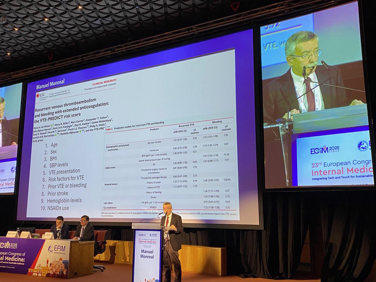 Deretter var det debatt om man skal fortsette med antikoagulantia 3-6 måneder etter uprovosert venøs tromboembolisme (VTE)? Francesco Dentali fra Italia presenterte argumentene for: Han viste til CHEST retningslinjen som tilsa 3 måneders behandling med antikoagulantia, men at risikoen for ny VTE er høy og at risikoen for blødning (ofte) er lav. Manuel Monreal fra Spania presenterte argumentene mot: Han pekte på at studier som ser på VTEgjentakelse gjerne underestimerer blødningsrisiko, men at de gir en indikasjon på risiko. Samtidig er gjentakelse av VTE lav hos de som behandles og øker når de ikke lenger behandles. Begge pekte på betydningen av å bruke en risikoskår ved vurdering, og begge anbefalte VTEPREDICT risiko skår, jf. bilde 8.