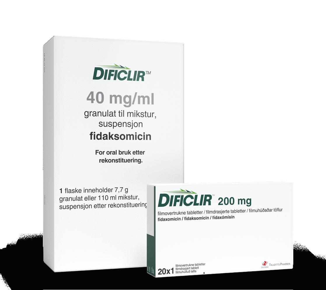 Indikasjoner: For behandling av Clostridioides difficile-infeksjoner (CDI), også kjent som C. difficile-assosiert diaré (CDAD). Tabletter: Hos voksne og pediatriske pasienter med en kroppsvekt på minst 12,5 kg. Granulat: Hos voksne, ungdom og barn 0 - < 18 år. For både tabletter og granulat skal det tas hensyn til offisielle retningslinjer for korrekt bruk av antibakterielle midler. Vanligste bivirkninger: Vanlige: Forstoppelse, kvalme, oppkast Vanligste alvorlige bivirkninger: Overfølsomhetsreaksjoner inkl. alvorlig angioødem. Interaksjoner: Forsiktighet utvises ved samtidig bruk av potente P-gp-hemmere. Kontraindikasjoner: Overfølsomhet for innholdsstoffene. Forsiktighetsregler: Fidaksomicin bør brukes med forsiktighet ved kjent allergi mot makrolider. Hvis det oppstår en alvorlig allergisk reaksjon, skal legemidlet seponeres og egnede tiltak igangsettes. Bør brukes med forsiktighet ved pseudomembranøs kolitt eller fulminant eller livstruende CDI, ved nedsatt lever- og nyrefunksjon. Granulat bør brukes med forsiktighet hos spedbarn < 6 måneder/< 4 kg. Graviditet, amming og fertilitet: Graviditet: Det anbefales å unngå bruk under graviditet. Amming: Det må tas en beslutning om amming skal opphøre eller behandling avstås fra, basert på nytte-/risikovurdering. Fertilitet: Dyrestudier indikerer ingen effekt på fertilitet. Dosering: Tabletter: Standard dosering: Voksne og barn ≥12,5 kg: Anbefalt dose er 200 mg (1 tablett) administrert 2 ganger daglig (1 tablett hver 12. time) i 10 dager. Utvidet pulsdosering: Voksne: 200 mg tabletter administreres to ganger daglig for dag 1–5 (ingen tablett på dag 6) og deretter én gang daglig annenhver dag for dag 7–25. Hvis en dose blir glemt, skal den glemte dosen tas så snart som mulig, men hvis det snart er tid for neste dose, skal tabletten hoppes helt over. Granulat: Voksne: Standard dosering: Anbefalt dose er 200 mg (5 ml) 2 ganger daglig (5 ml hver 12. time) i 10 dager Utvidet pulsdosering: Tas 2 ganger daglig på dag 1-5 (ingen dose på dag 6) og deretter 1 gang daglig annenhver dag på dag 7-25. Ungdom og barn 0 - < 18 år: Anbe falt dose baseres på kroppsvekt og tas 2 ganger daglig (1 dose hver 12. time) i 10 dager. Administrering: Tabletter: Kan tas med eller uten mat. Svelges hele sammen med et glass vann. Granulat: Rekonstitueres av farmasøyt eller helsepersonell. Tas peroralt, med eller uten mat, eller ved behov via en enteral sonde med sprøyte. Pakninger og priser: Tabletter 20 stk. (blister) kr 18 099,90. Granulat til mikstur: 1 stk. (glassflaske) kr 18 288,90. Reseptgruppe C. DIFICLIR er tilgjengelig til rabattert pris via LIS-anbud og er gjenstand for individuell refusjon for blå resept, for mer informasjon; se Helsedirektoratets hjemmeside. Basert på SPC godkjent av DMP/EMA: 01.12.2023.