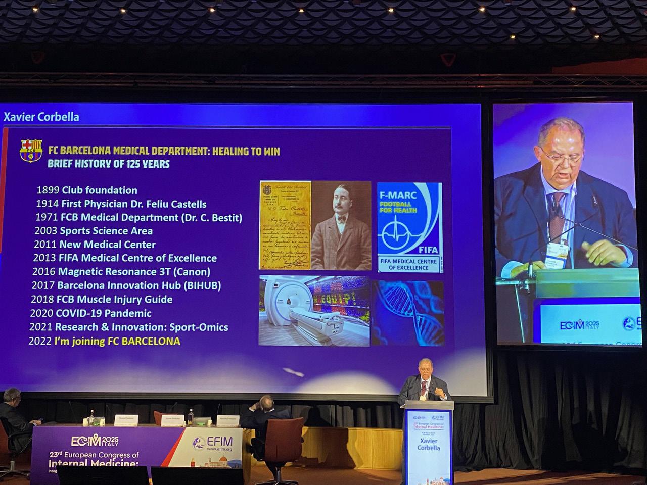 Xavier Corbella Viros fortalte om de mange liv man kan leve som indremedisiner, jf. bilde 3. Han hadde jobbet klinisk i mange år og blitt mer og mer opptatt av ledelse og økonomi, og slik ble han etterhvert sykehusdirektør. Han opplevde dette som vanskelig og gikk tilbake til å være seksjonsleder. Så en dag ble han kontaktet av noen som ikke ville si hvem han skulle snakke med og knapt nok hvor han skulle møte da de ønsket å tilby ham en jobb: Til sin store overraskelse ble han møtt av direktøren for Barcelona fotball klubb. Etter å ha bekreftet at han hadde heiet på Barcelona siden han var barn, og var fan av klubben, ble han tilbudt jobben som medisinsk direktør for Barcelona fotball klubb. Han opplevde dette som kjempeinteressant og trivdes i denne jobben hvor han jobbet for å forebygge skader og behandle fotballspillerne slik at klubben skulle vinne!