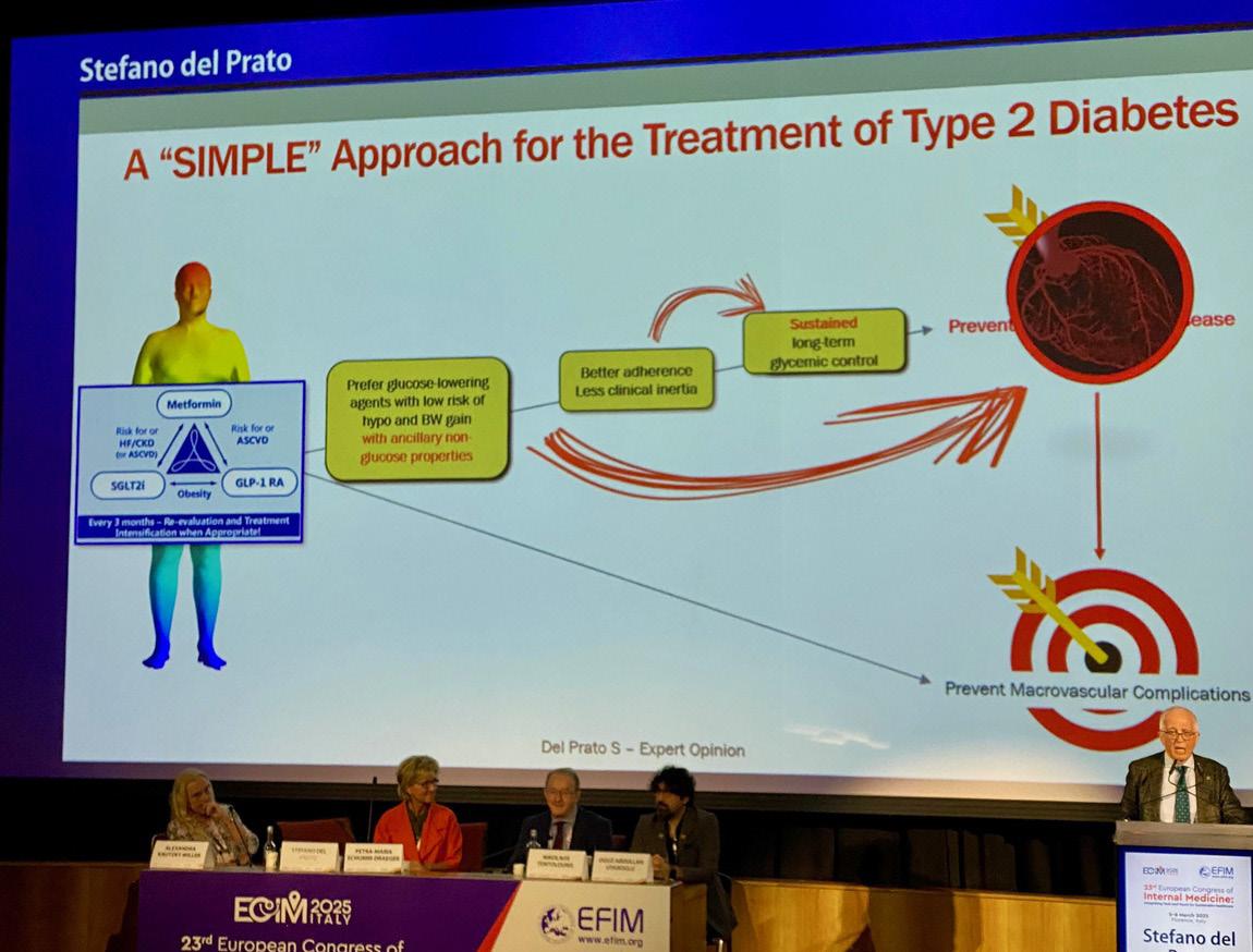 The European Association for the study of Diabetes (EASD) hadde en sesjon der Stefano del Prato fra Italia gjennomgikk hvordan man hadde gått fra glukose senkende medikamenter som metformin og sulfonylureapreparater til sykdomsmodifiserende legemidler som SGLT2-hemmere og GLP1reseptor agonister i 2020-årene. Og videre til «SIMPLE» tilnærming til behandlingen av type 2 dia betes: Enkel (Simple) kombinasjonsterapi, Multippel (M) risiko reduksjon, Primær helsetjeneste (P) team, Livsstilsendring (L)/ forebygging og re-Evaluering (E), jf. bilde 4. For de fleste pasienter, vil livsstilsendringer + metformin og sykdomsmodifiserende medikamenter være aktuelt.