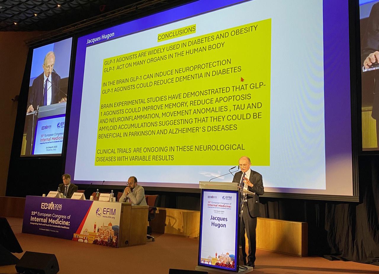 Jacques Hugon ved Universitet av Paris, pekte på at GLP1-agonister. hadde vist seg å ha en positiv effekt på kognitiv svikt og søvnforstyrrelser. Han hevdet også at GLP1-agonister hadde vist redusert insidens av demens i forhold til andre anti-diabetika, og at de så ut til å redusere risiko for kognitiv svikt. Dette var imidlertid blant pasienter med diabetes – ikke blant pasienter med nevrodegenerative sykdommer. Det er derfor nødvendig med