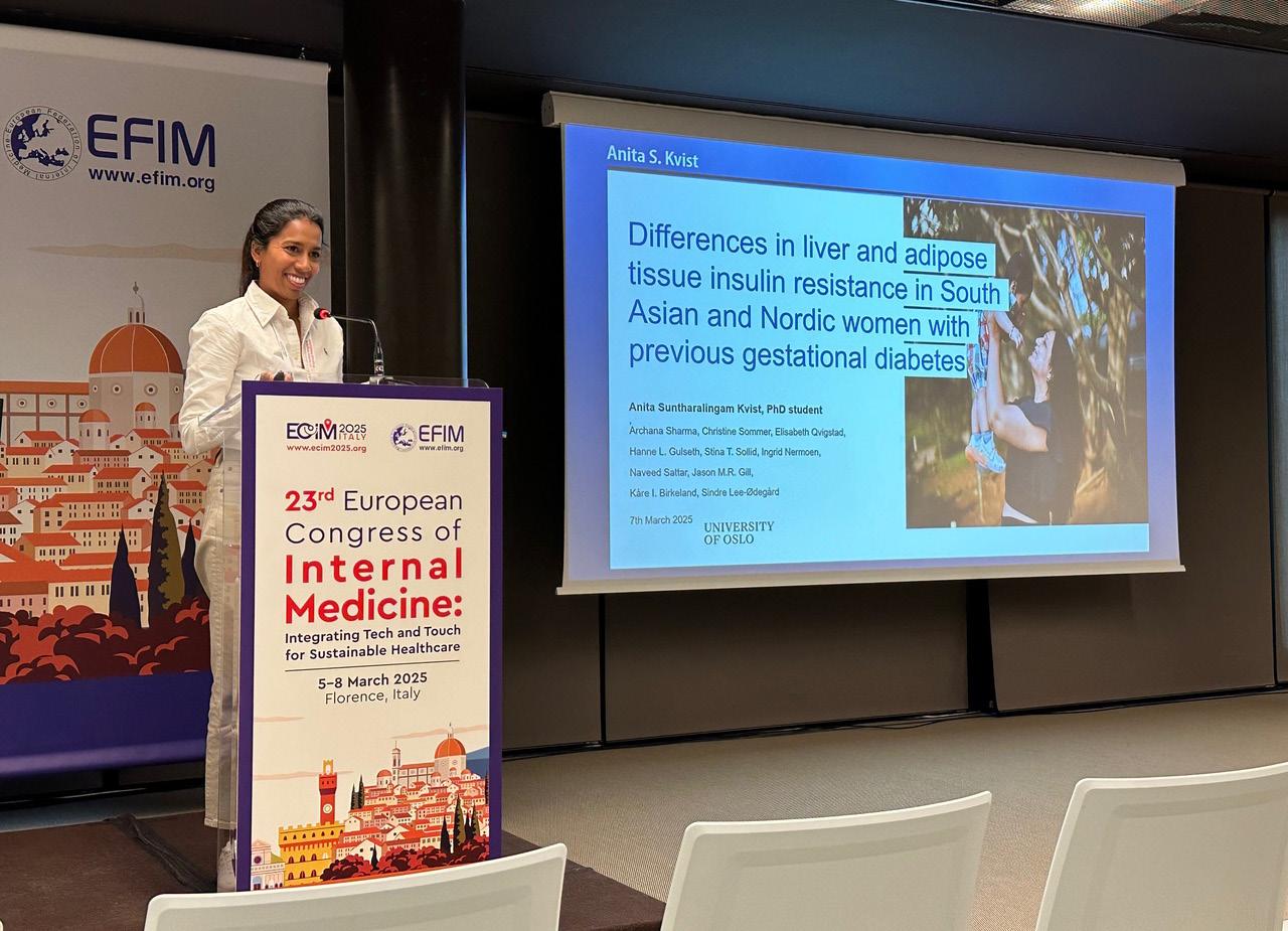 På kongressen presenterte Anita Suntharalingam Kvist deres funn fra en studie av kvinner med tidligere svangerskapsdiabetes, der man sammenlignet interaksjonen mellom fettvev og lever hos sørasiatiske og nordiske kvinner bosatt i Oslo- området. I foredraget la hun særlig vekt på hvordan nedsatt nedregulering av frie fettsyrer, forhøyede nivåer av inflammasjonsmarkører og redusert adiponektin tyder på økt insulinresistens i fettvev hos sørasiatiske kvinner – selv i normoglykemisk tilstand. De viste også at høyere nivåer av leverproteinet fetuin-A delvis forklarte de etniske forskjellene i insulinresistens, og at dette kan være en viktig brikke i hvorfor sørasiatiske kvinner har høyere risiko for å utvikle type 2 diabetes etter svangerskapsdiabetes. De konkluderte med viktigheten av etniske forskjeller i metabolsk risiko og behovet for mer persontilpasset forebygging av type 2 diabetes, jf. bilde 11.